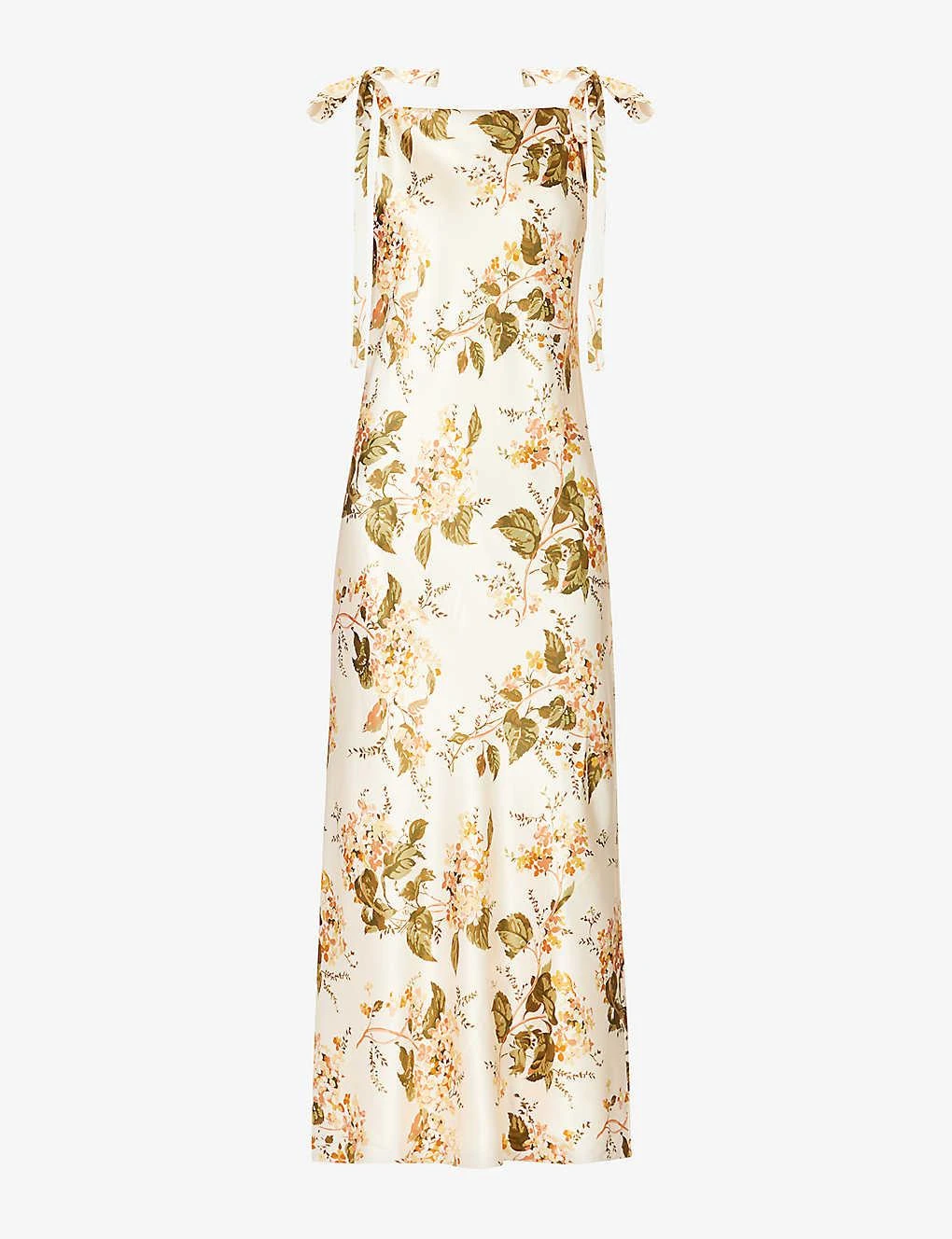 If you thought that style and sustainability were mutually exclusive, think again. Meet Reformation: the Los Angeles-based label expertly combining eco-conscious production with Cali-cool fashion. From organic materials, fibres made from trees and deadstock to transparency reports, climate-neutral manufacturing and limited drops, Mother Nature is woven into every aspect of the brand, meaning your wardrobe and the planet have never looked so good. Win-Win. Reformation silk midi dress100% silk; lining 100% viscoseConcealed zip fastening at sideRelaxed fit, straight-across-neck, self-tie shoulder straps, all-over floral pattern, linedDry clean onlyTrue to sizeSize medium: length 52in / 132cmModel is 5ft 11in/1.80m and wears a size mediumLightweight, non-stretch. Colour: metallic