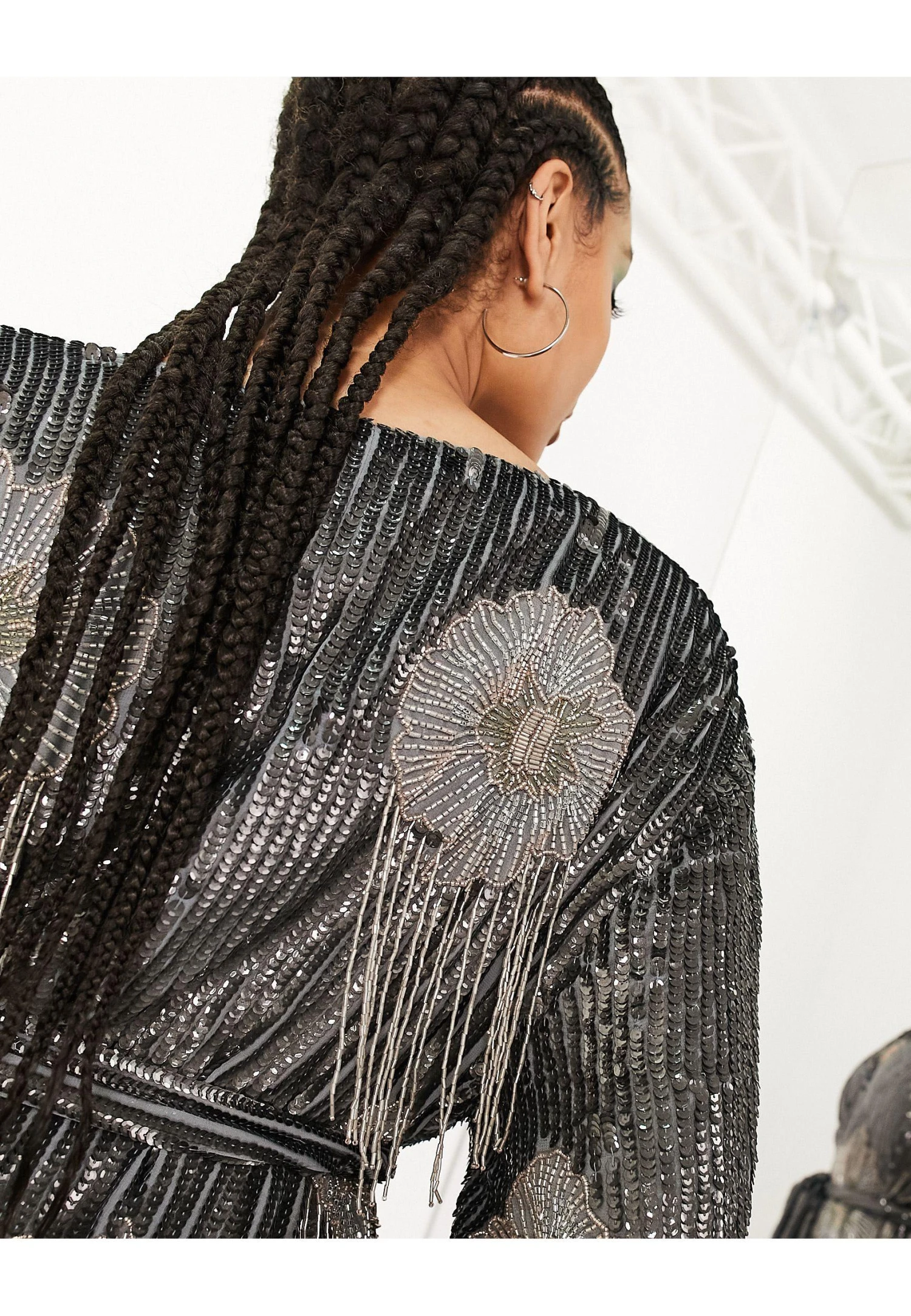 Dresses by ASOS EDITION All other dresses can go home Wrap front Puff sleeves Tie waist Beaded fringing Regular fit. Colour: black