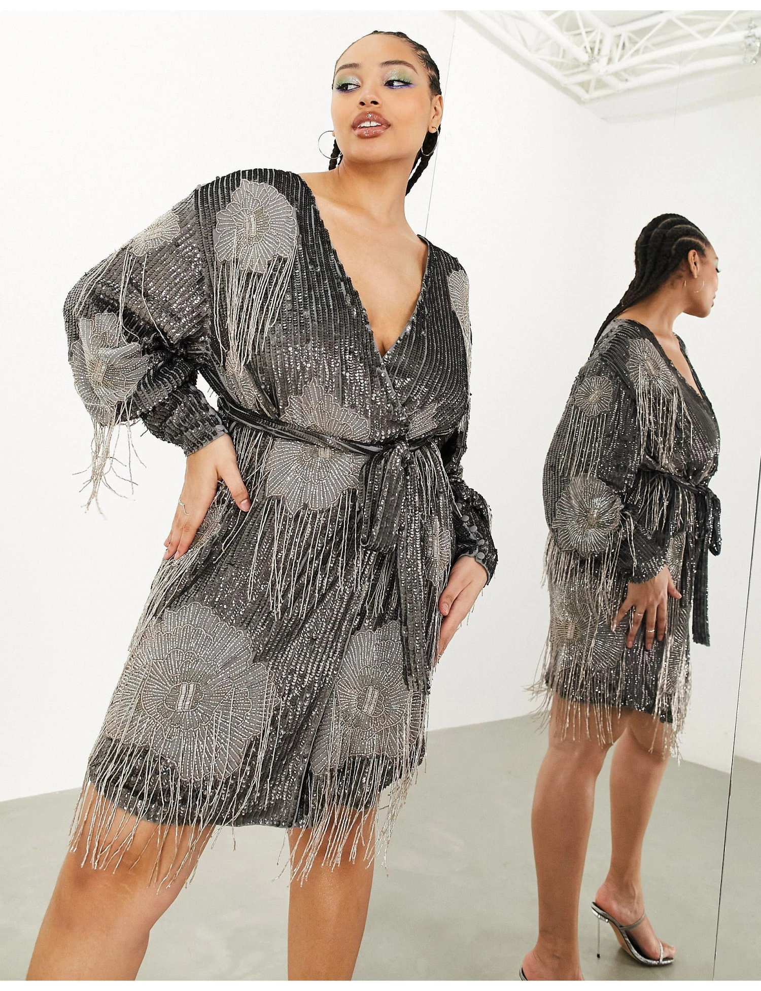 ASOS Curve Floral Fringe Sequin Wrap Mini Dress