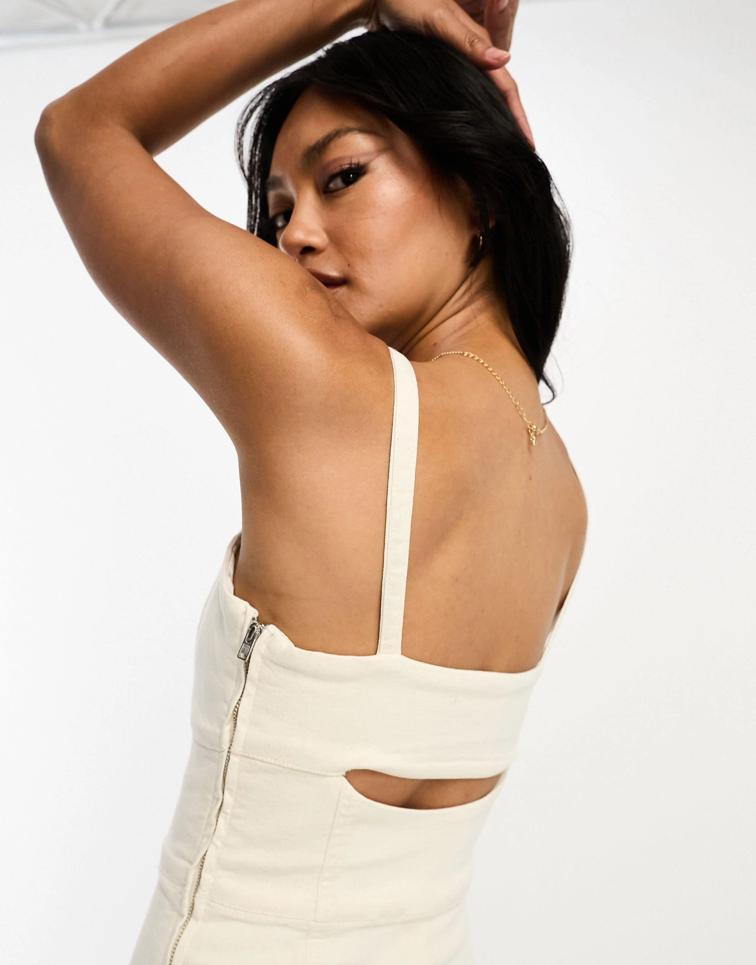 Dresses by ASOS DESIGN The denim of your dreams V-neck Fixed straps Cut-out panel to back Zip-side fastening Kick split Slim fit.