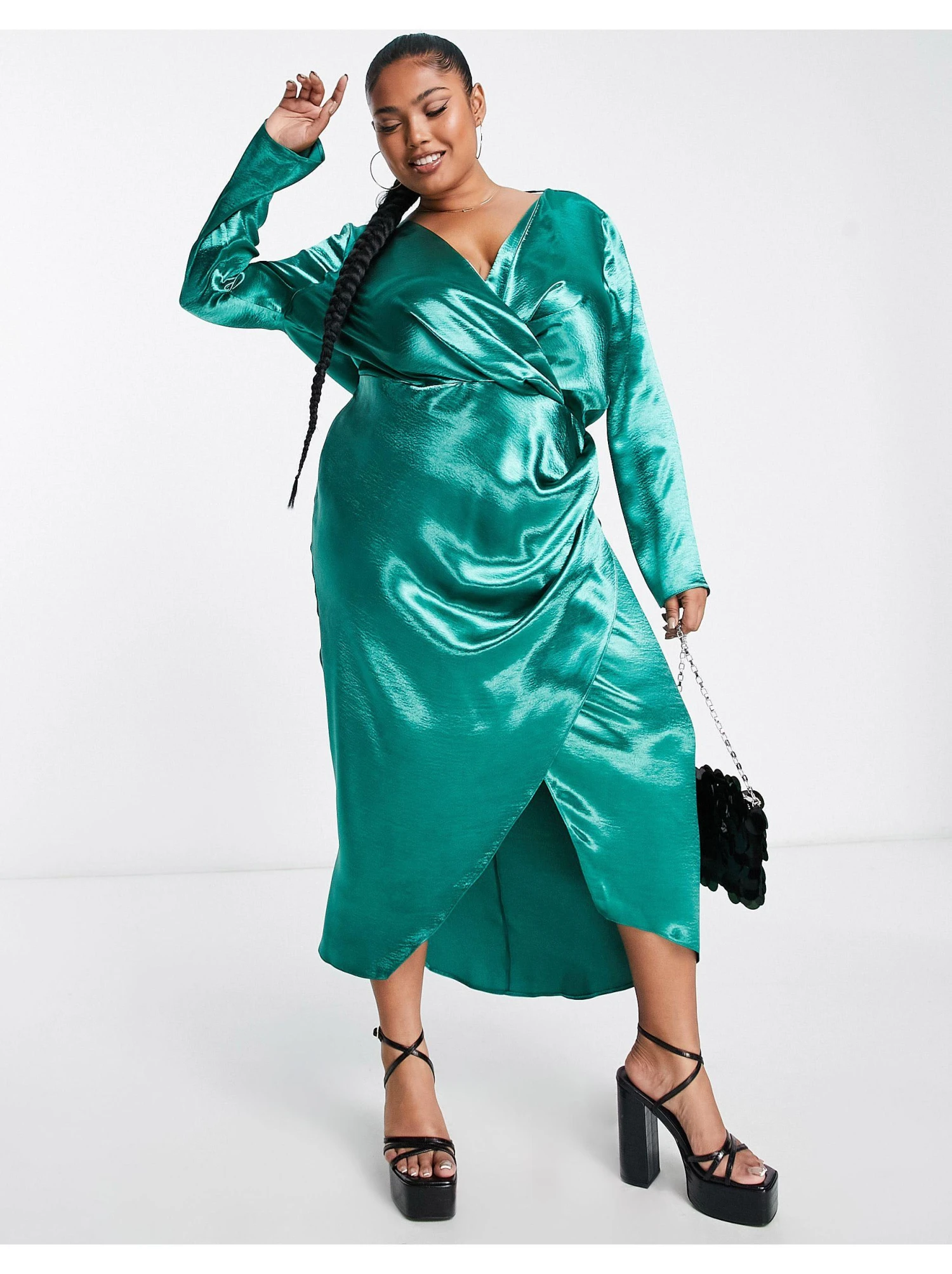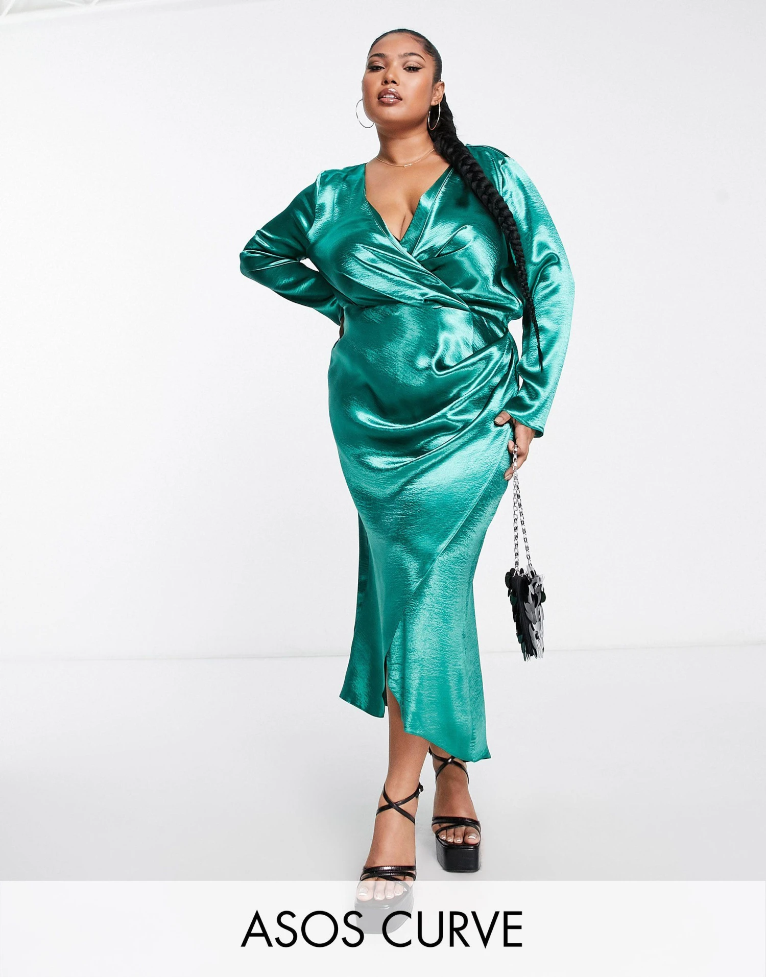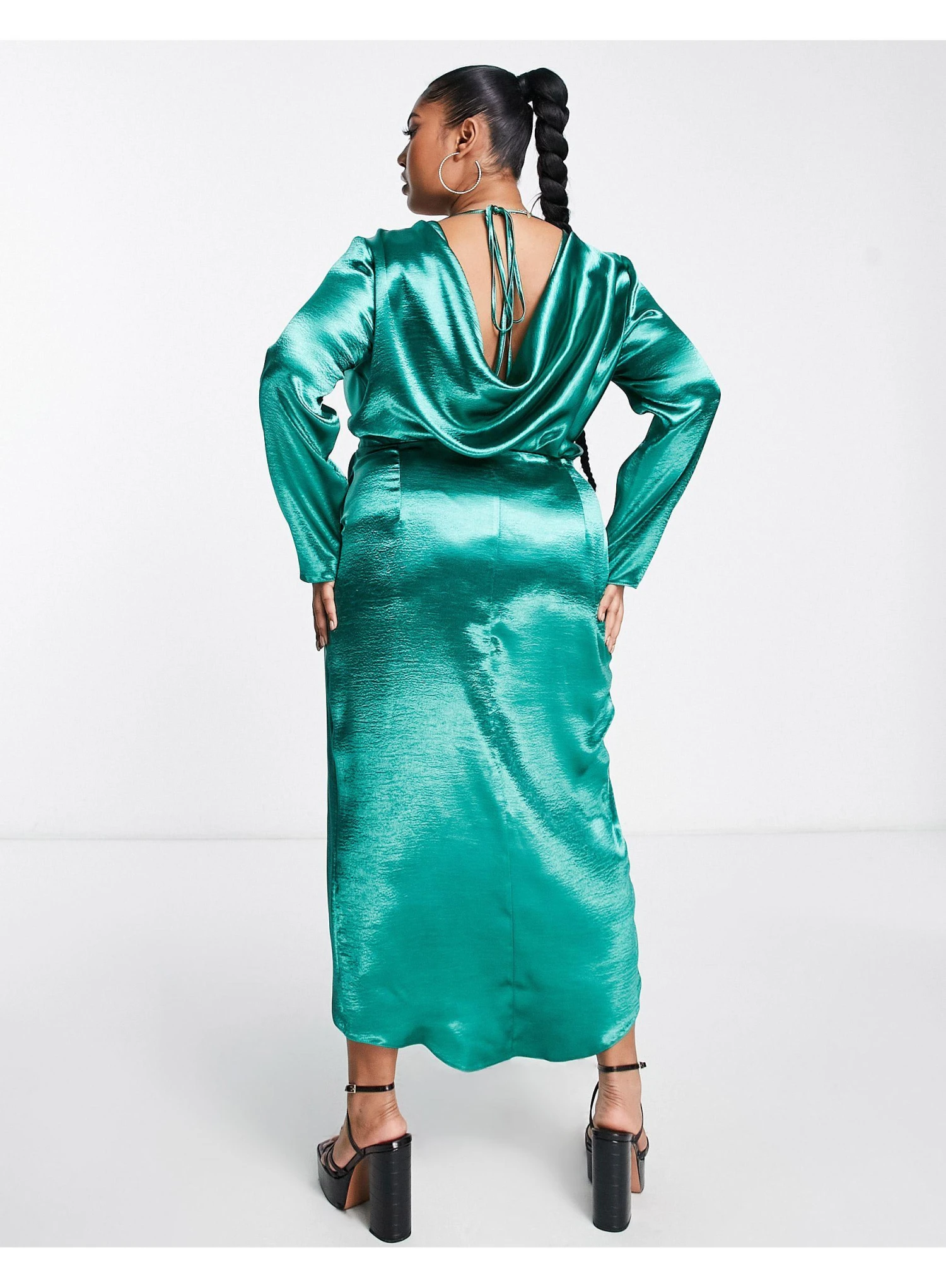 Asos Design Curve Wrap Front Satin Midi Dress With Cowl Back Detail