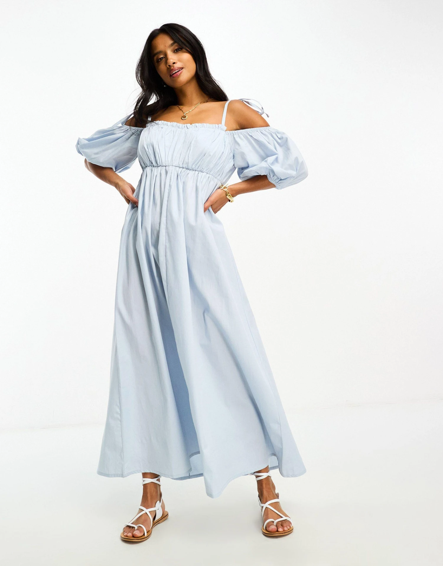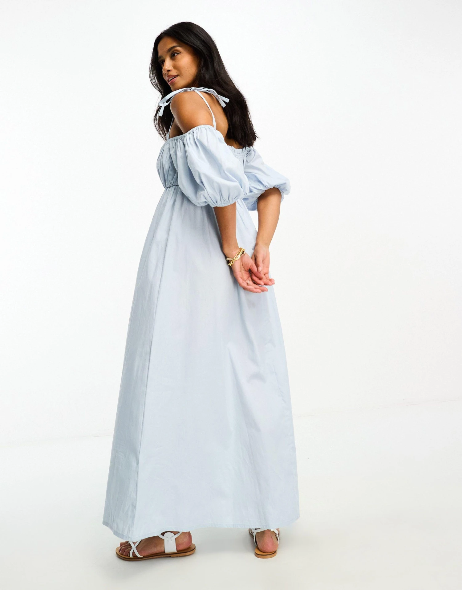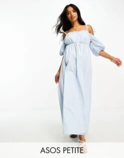Petite by ASOS Petite Warm-weather ‘drobe: loading Off-shoulder style Tie straps Puff sleeves Regular fit. Colour: blue