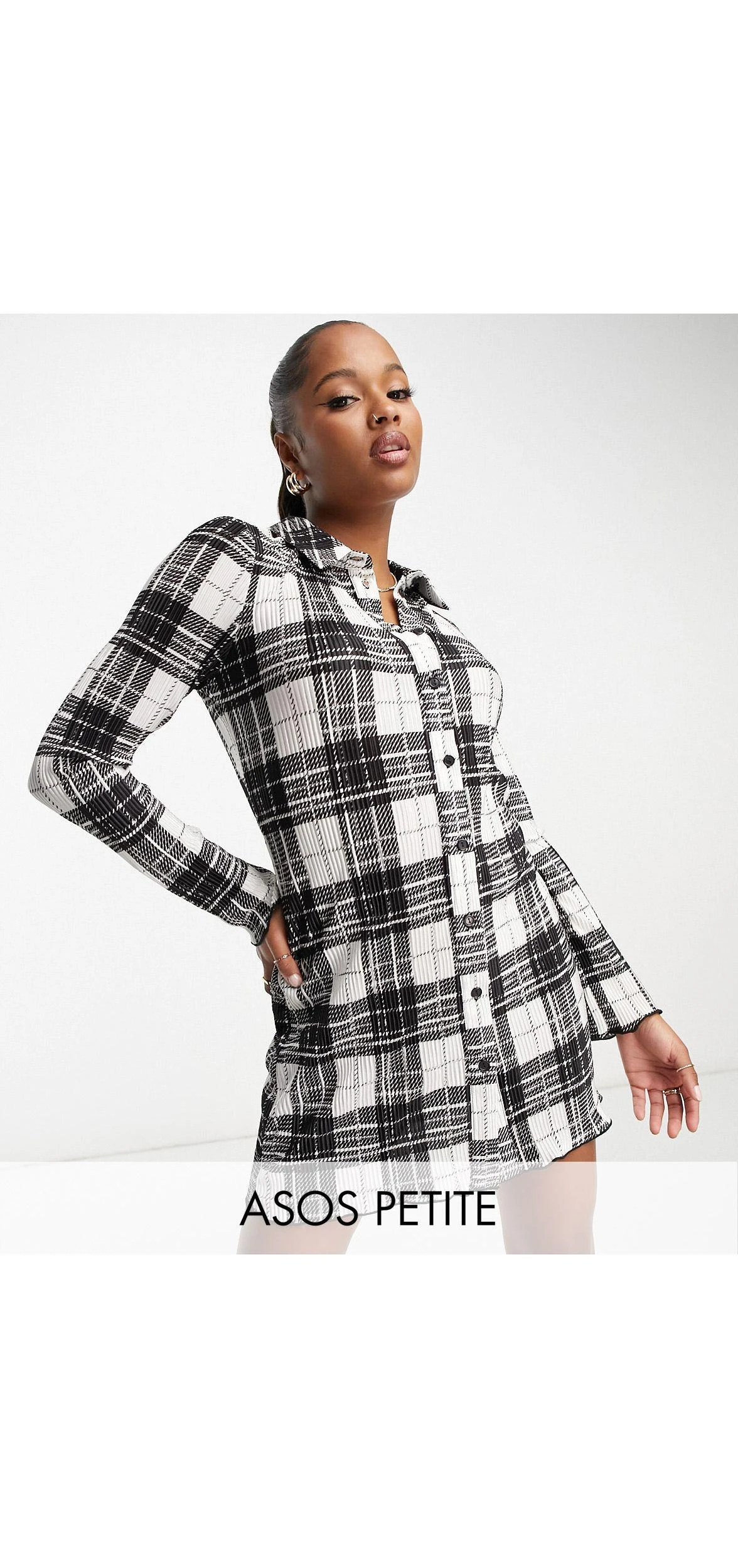 Petite by ASOS Petite All other dresses can go home Check design Spread collar Long sleeves Button placket Regular fit. Colour: white
