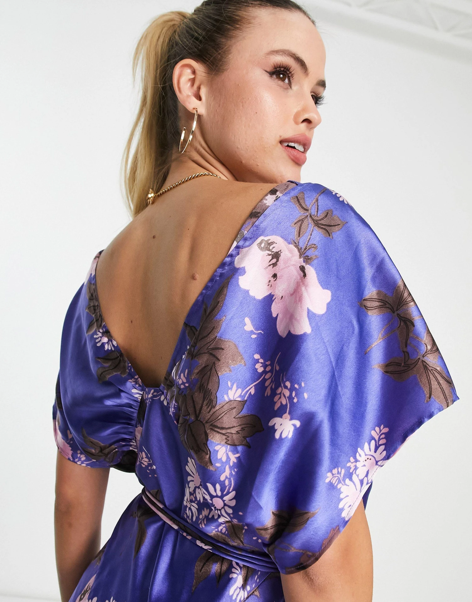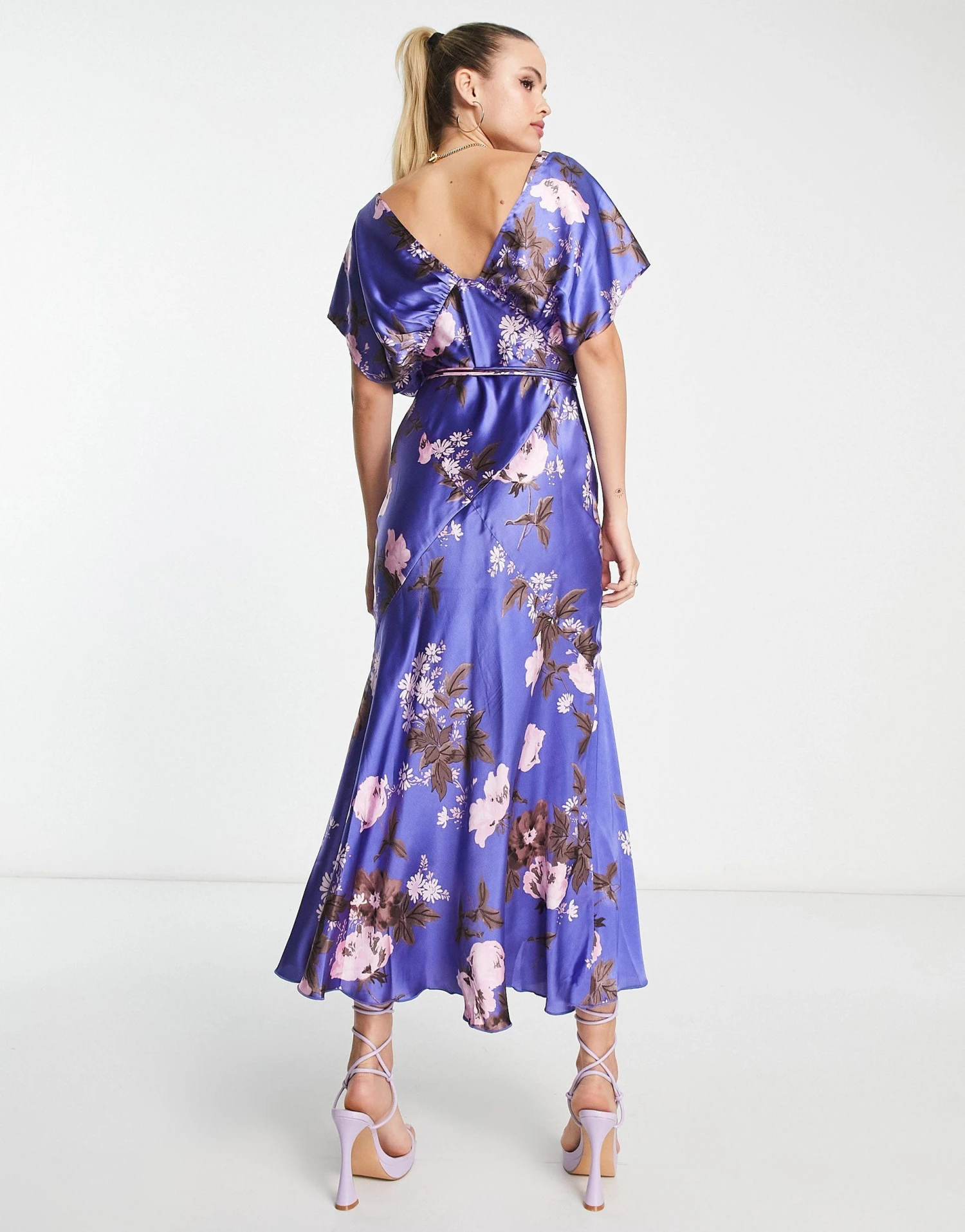 Asos Design Tall Satin Batwing Midi Dress With Large Floral Print