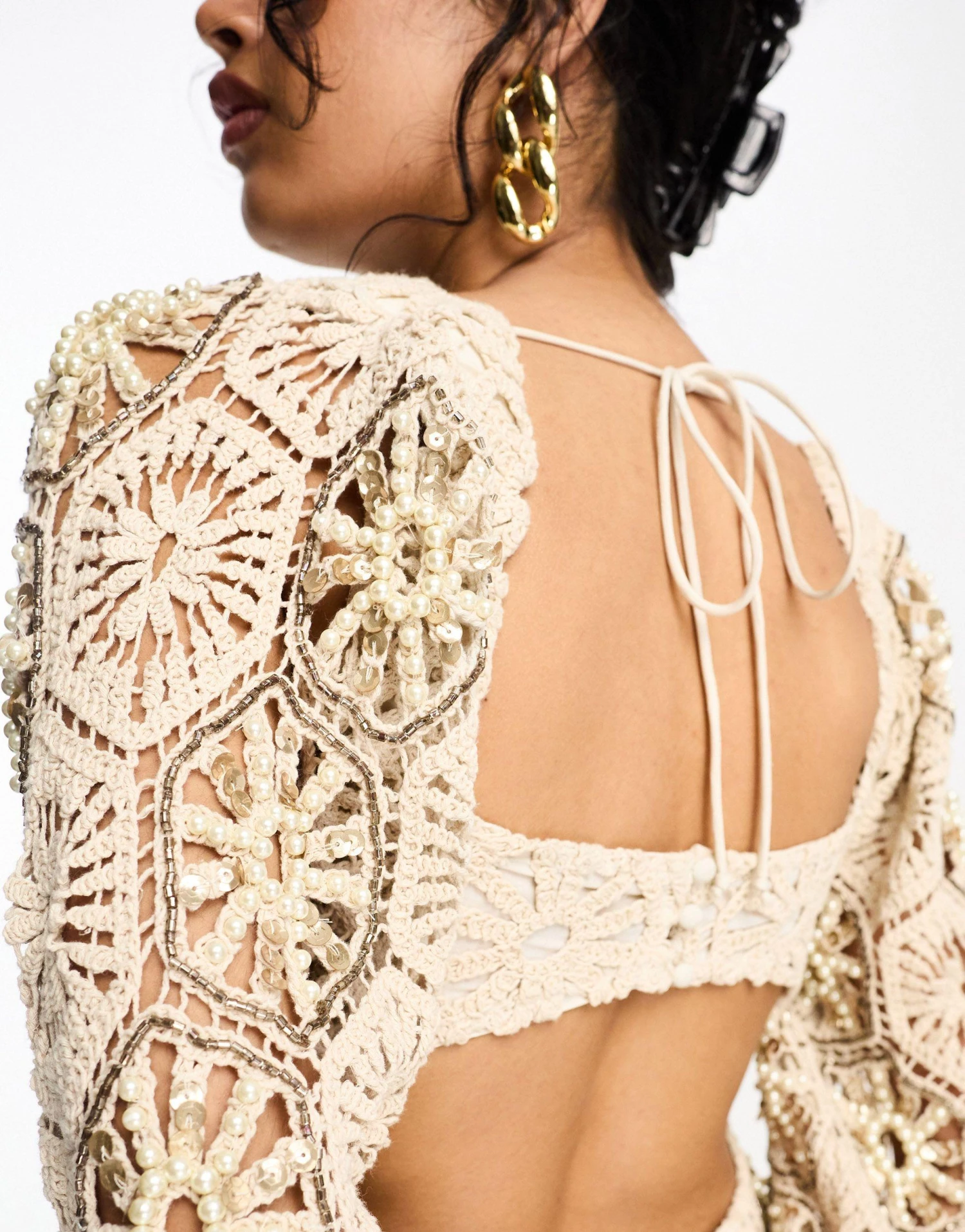 ASOS Embellished Crochet Milkmaid Mini Dress With Blouson Sleeve