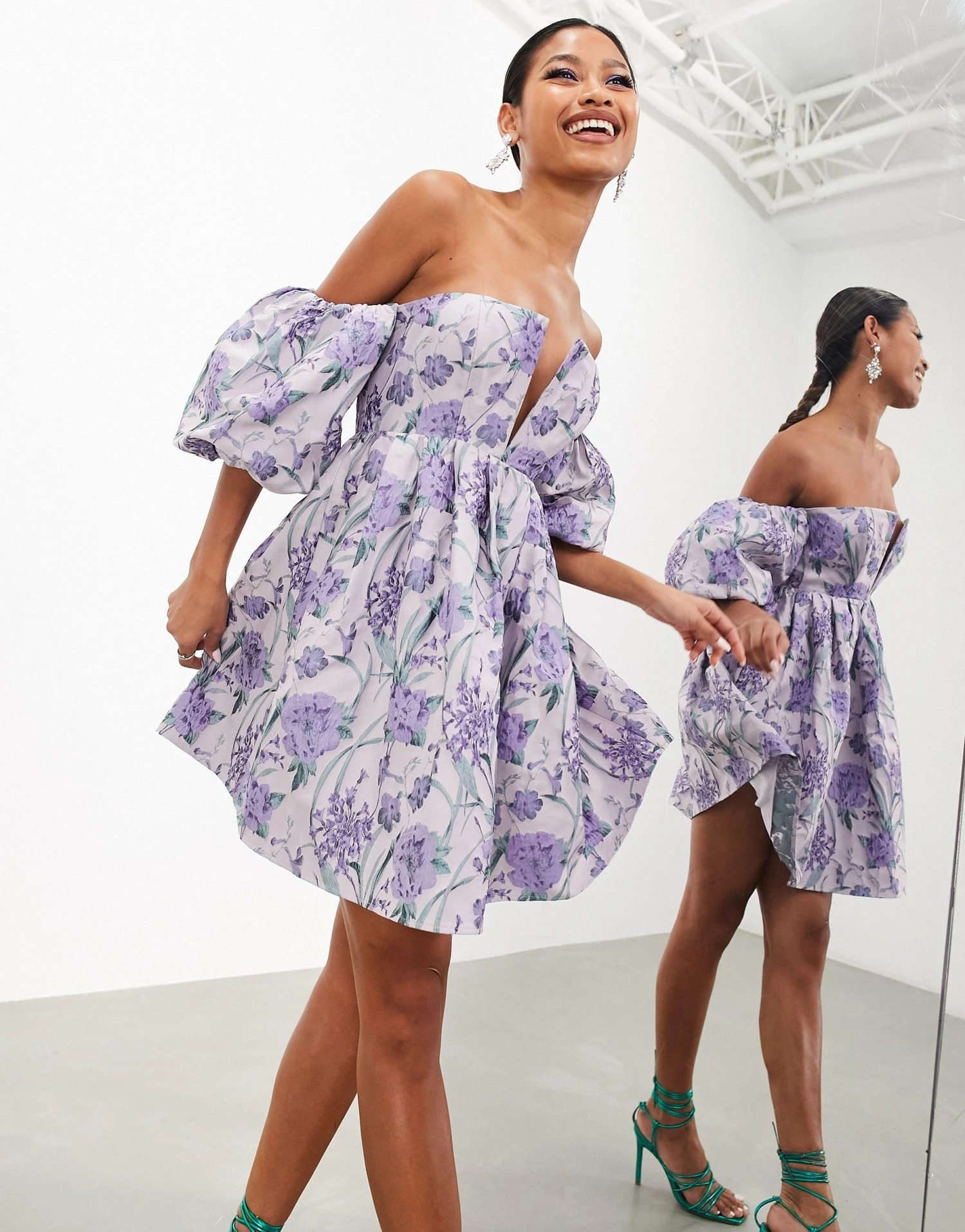 ASOS Jacquard Off The Shoulder Volume Sleeve Mini Dress