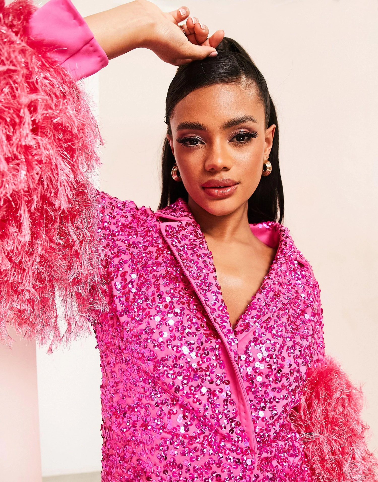 ASOS Sequin Blazer Dress With Cut Out Back With Faux Feather Sleeve