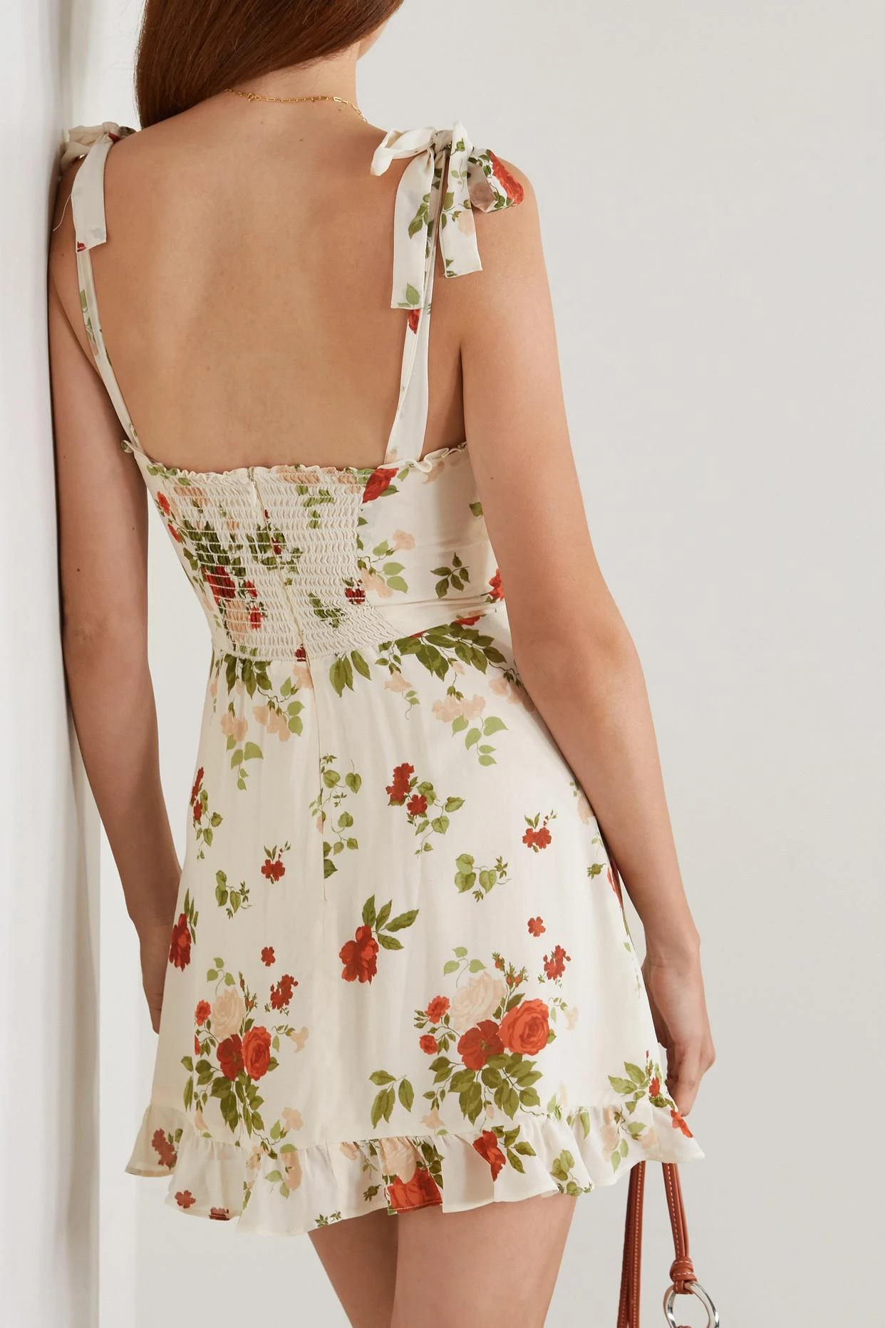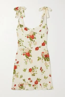Reformation is known for its pretty floral dresses. Cut from georgette, this ‘Christine’ style is printed with roses and has a fluttery ruffled hem. The sweetheart neckline and self-tie straps will elegantly frame a gold pendant. Colour: white