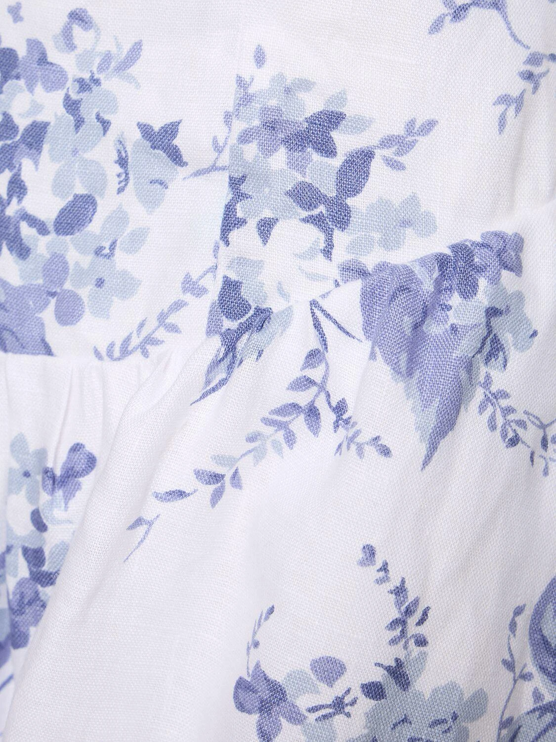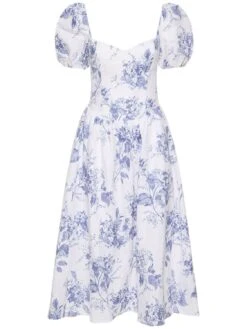 Back zip closure. Back elastic stitching at bodice. All over print placement may vary. Two side pockets. Model is wearing a size6. Colour: blue