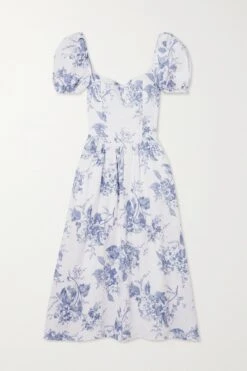 Reformation’s ‘Davila’ dress is decorated with the brand’s ‘Lupine’ print, which is reminiscent of ornamental ceramic florals. Perfect for summer parties and picnics, it’s made from linen with a fitted, shirred bodice, puffed sleeves and an A-line skirt. Wear yours with a dainty necklace. Colour: blue