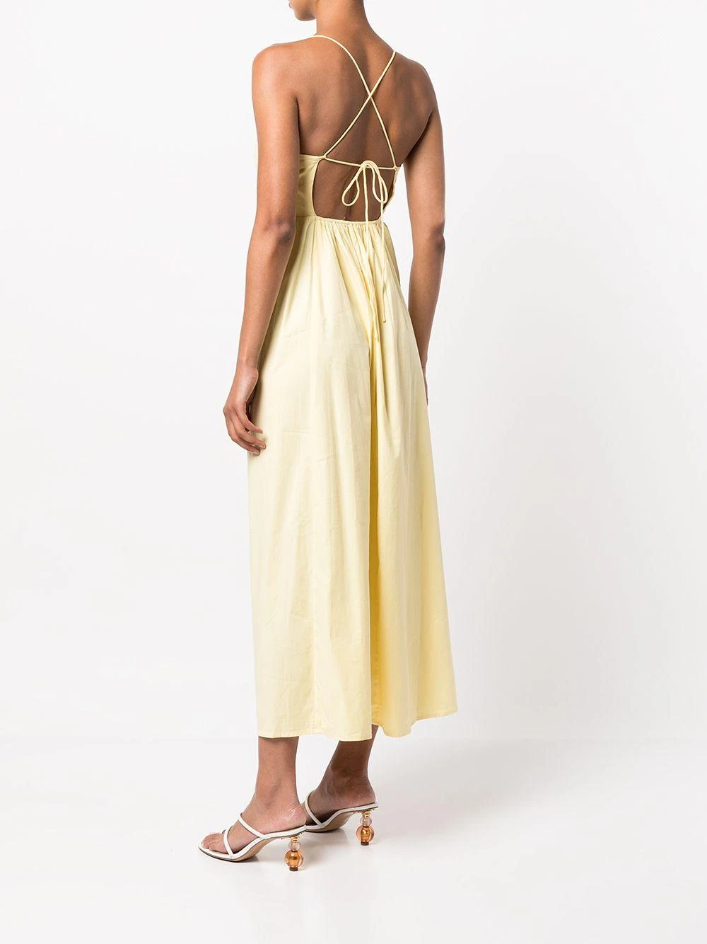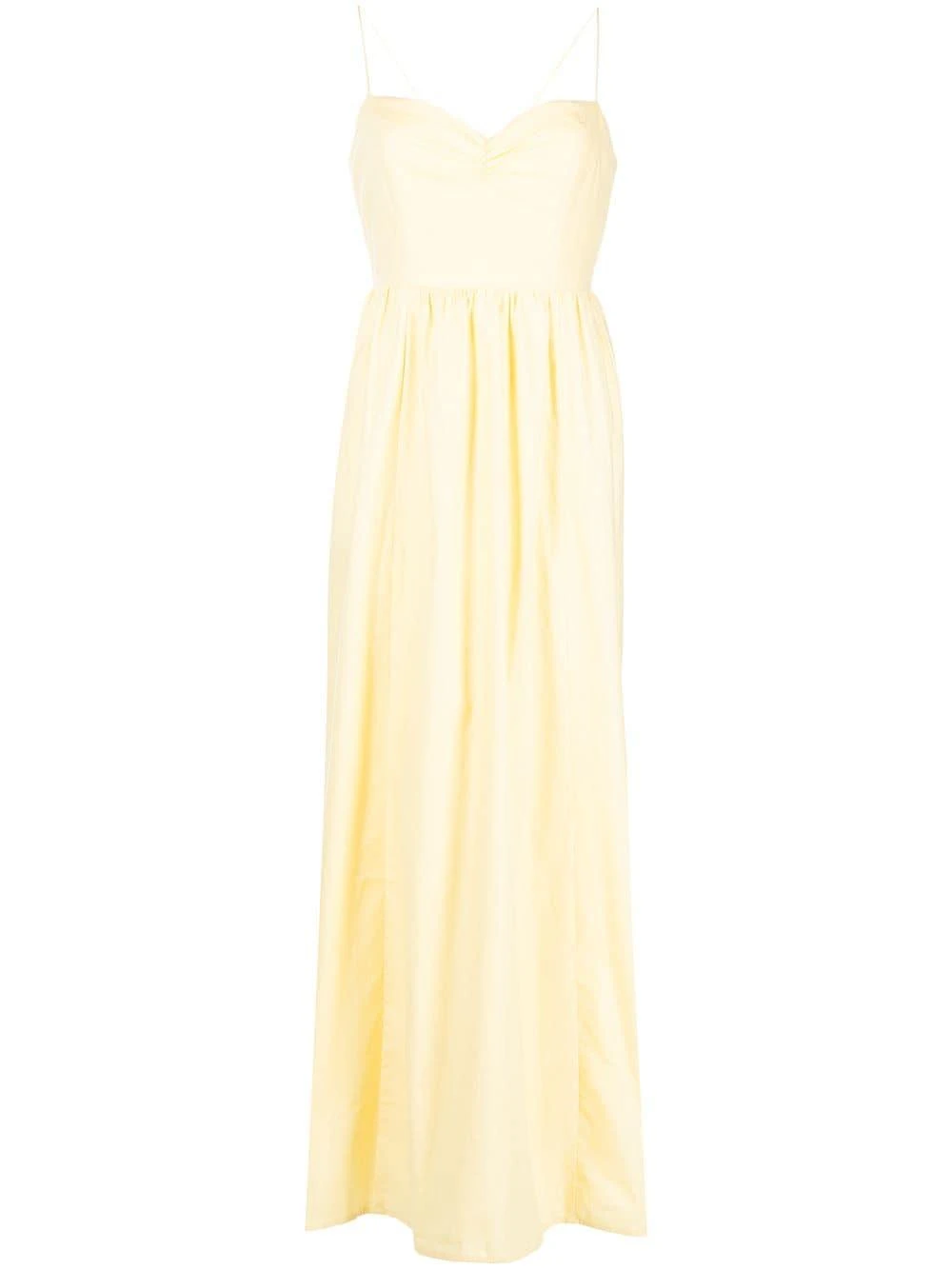 Dovie sweetheart neck dress from Reformation featuring lemon yellow, organic cotton blend, sweetheart neck, ruched bodice, spaghetti straps, open back, rear tie fastening and long length. Conscious: We’ve partnered with Good On You – an ethical agency that rates how sustainably brands perform. This item comes from a brand that performs well in relation to their impact on the planet. Colour: metallic