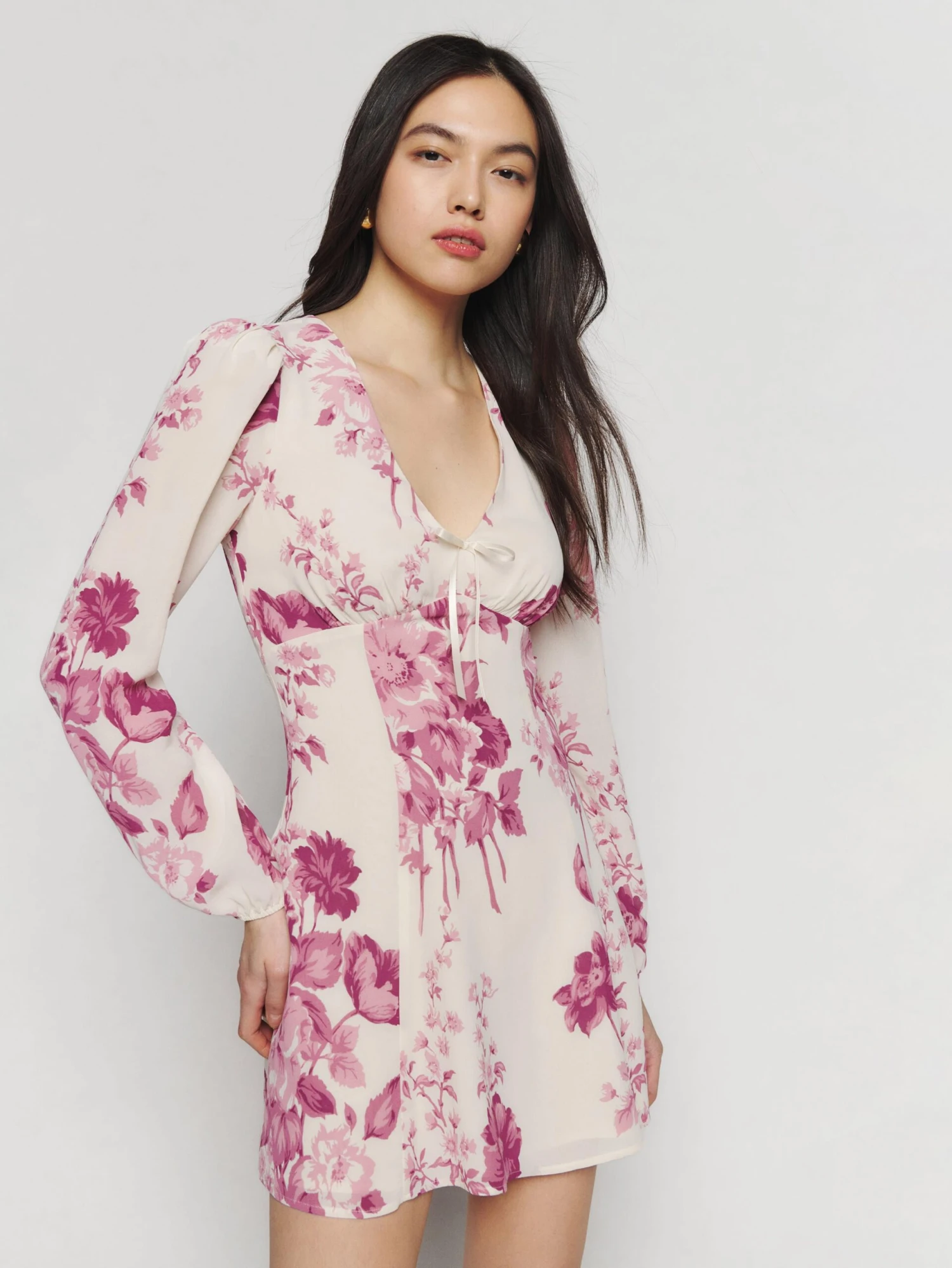Short and sweet. The Ferris is a long sleeve, V-neckline, fitted, mini dress. It features puff sleeves and a front tie detail. Colour: pink