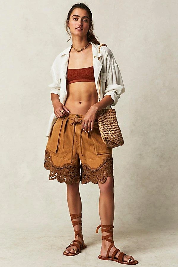 A classic silhouette with that hand-touched FP charm, these shorts are sure to stun with every wear. Fit: Low-slung, slouchy silhouette Features: Zip fly and button closure, drawstring waist feature, utility pockets, exaggerated scalloped crochet hem Why We ❤ It: Perfectly thrown over your swimsuit or elevated with a billowy blouse, this style has endless ways to wear. Colour: brown