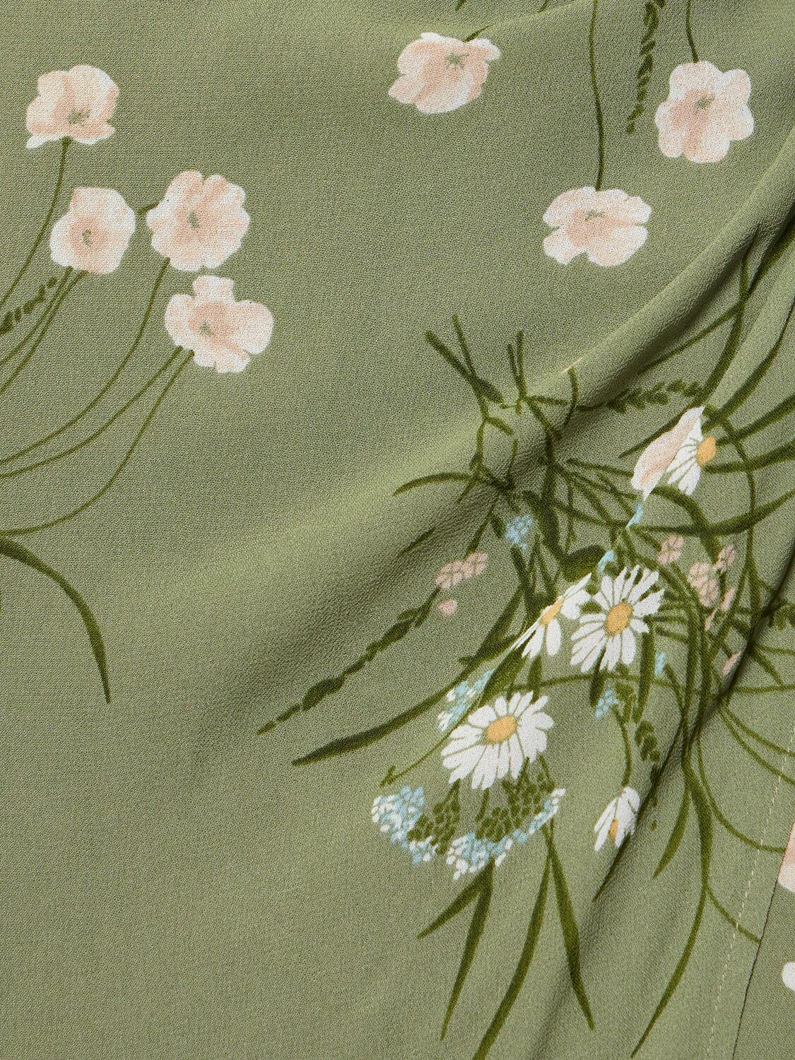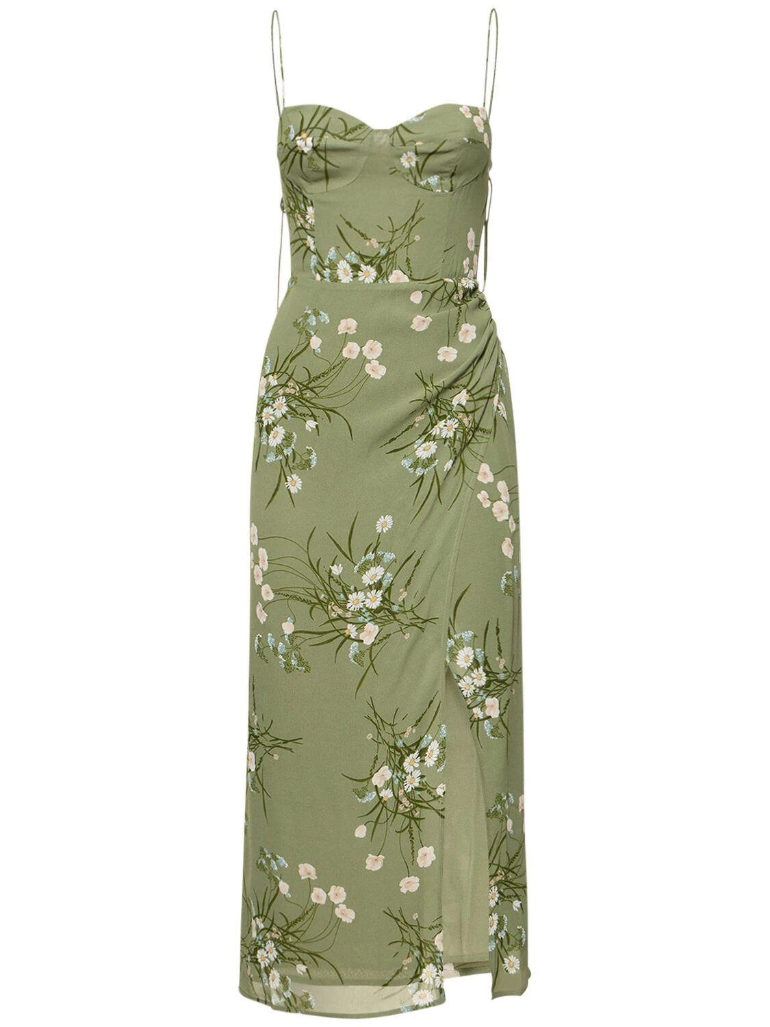 Spaghetti straps. Back zip closure. Side slit. All over print placement may vary. Lined. Model is wearing a size0. Colour: green