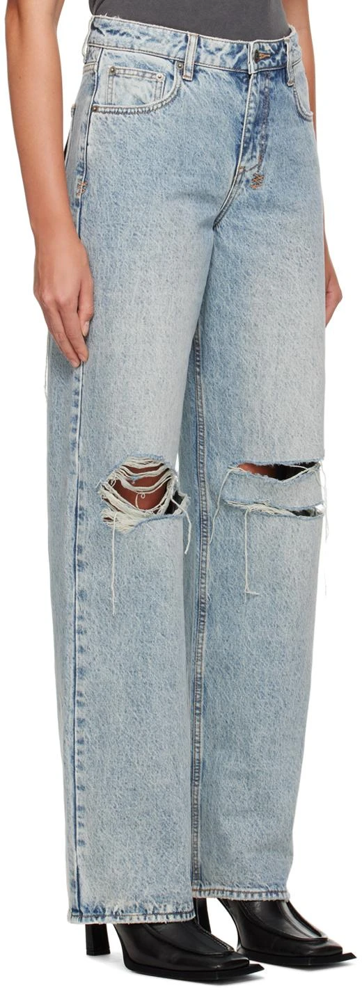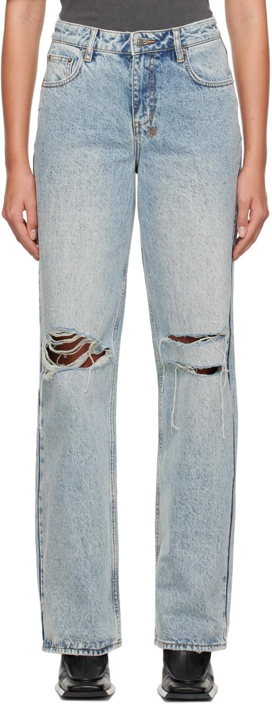 Straight-leg stone-washed non-stretch denim jeans. Fading and distressing throughout. Colour: blue