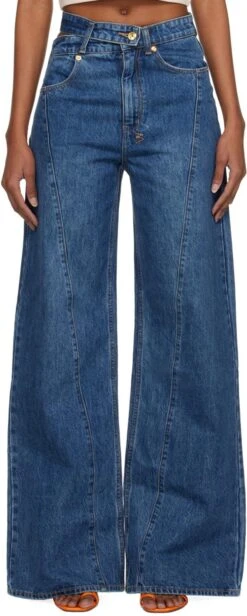 Wide-leg non-stretch denim jeans. Fading throughout. Asymmetric construction · Cutout at waistband · Belt loops · Four-pocket styling · Zip-fly · Pinched seams at front · Logo embroidered at back · Rubberized logo patch at back leg · Gold-tone hardware · Contrast stitching in yellow Part of the Ksubi x P.E Nation collaboration. Colour: blue