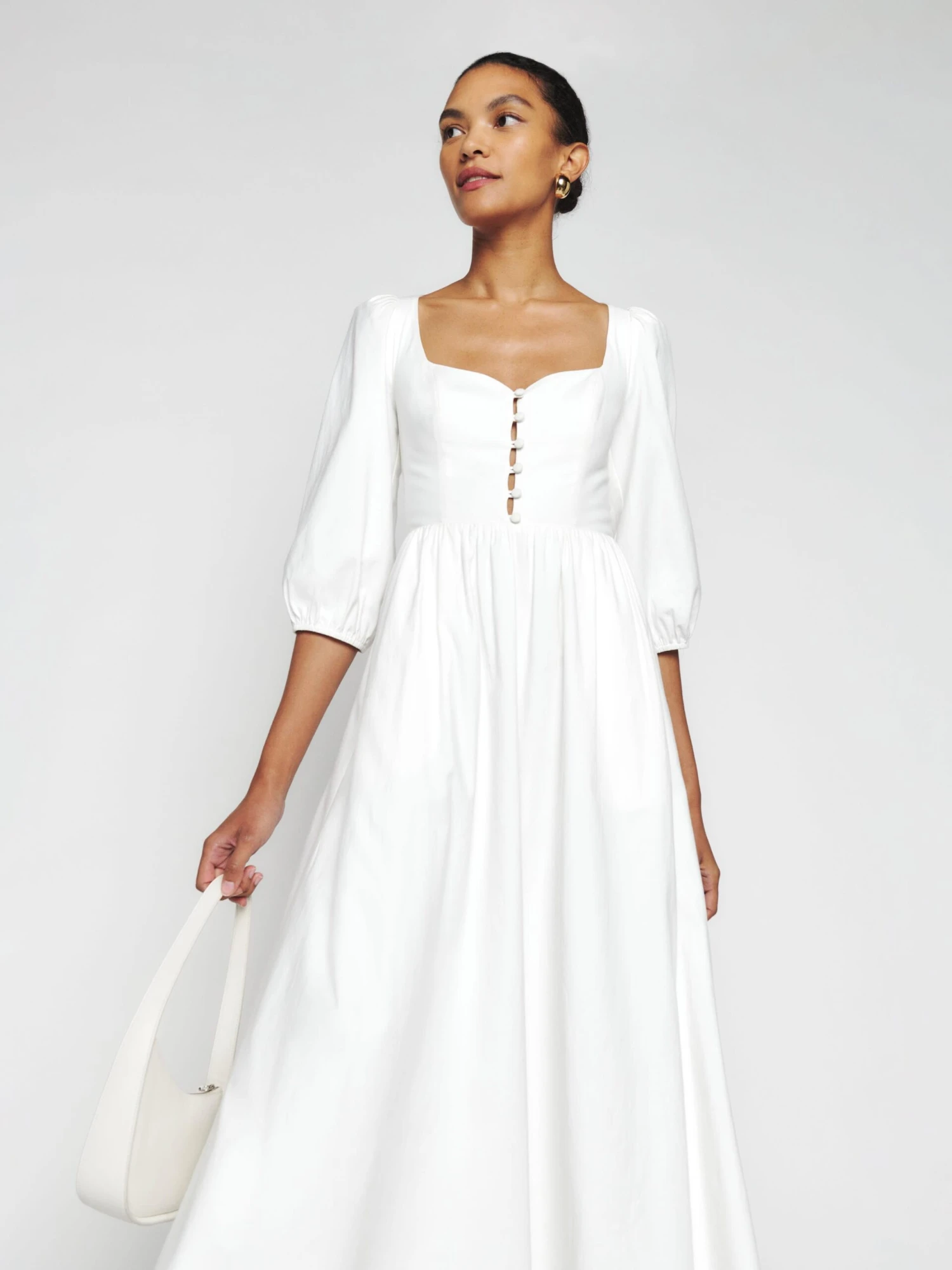 The perfect dress doesn’t exi- The Madden is a midi dress with a length, puff sleeve. It features a corset style top with button detailing and a zipper back entry. Colour: white