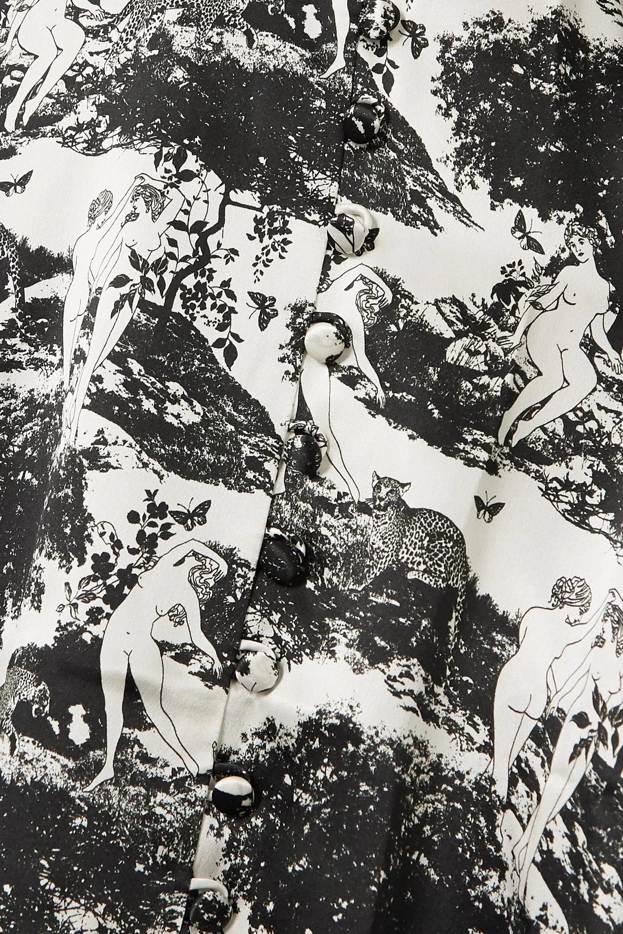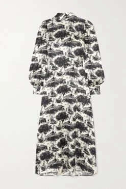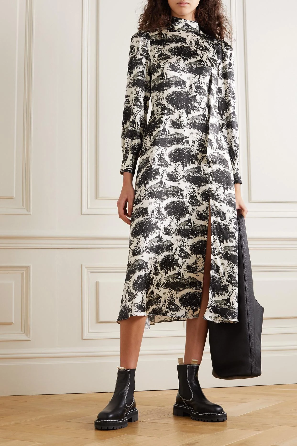 Reformation’s ‘Maple’ dress is decorated with whimsical flora and fauna motifs evocative of traditional French toile de joie. It’s made from silk-satin with subtle blouson sleeves and elegant neckties. The split skirt works well with knee or ankle boots. Colour: white