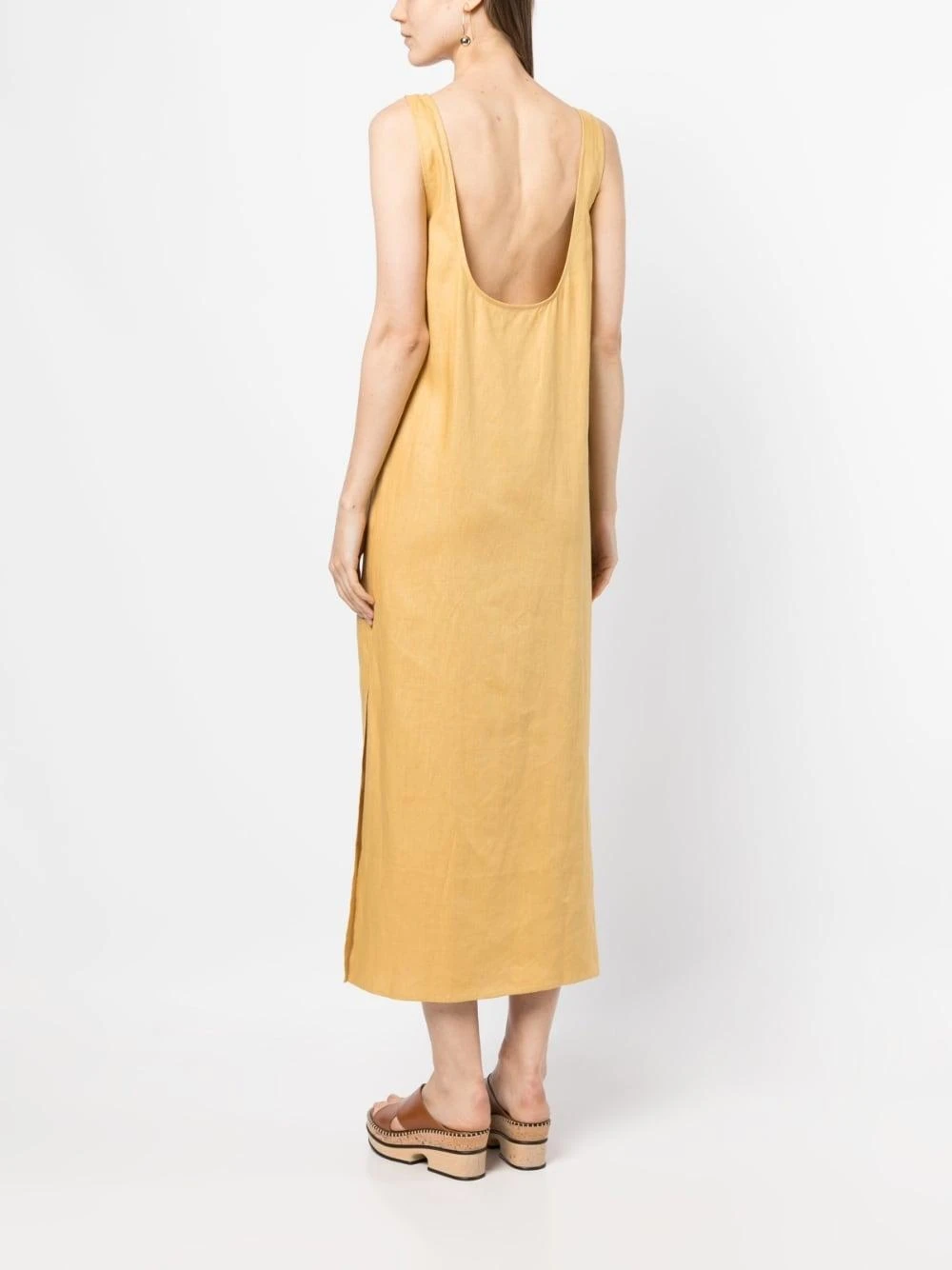 Marcie linen long dress from Reformation featuring sunset yellow, linen/flax, boat neck, open back, sleeveless, side slit and long length. We’ve partnered with Good On You — an independent agency that rates how brands perform in relation to their impact on the planet, people and animals, with a multi-criteria rating simplified to a five points scale. In order to be awarded our conscious label, larger brands need to score a minimum of four out of five (‘Good’), while smaller brands must score at least three out of five (‘It’s a start’). This item comes from a brand rated four out of five (‘Good’) by Good on You. Please note, this is a brand-level rating and does not guarantee that this product is made with conscious materials. Learn more about what makes a product Conscious on our Conscious Criteria page. This item may not be on sale in France, UK, Italy, Belgium and Switzerland. Colour: metallic