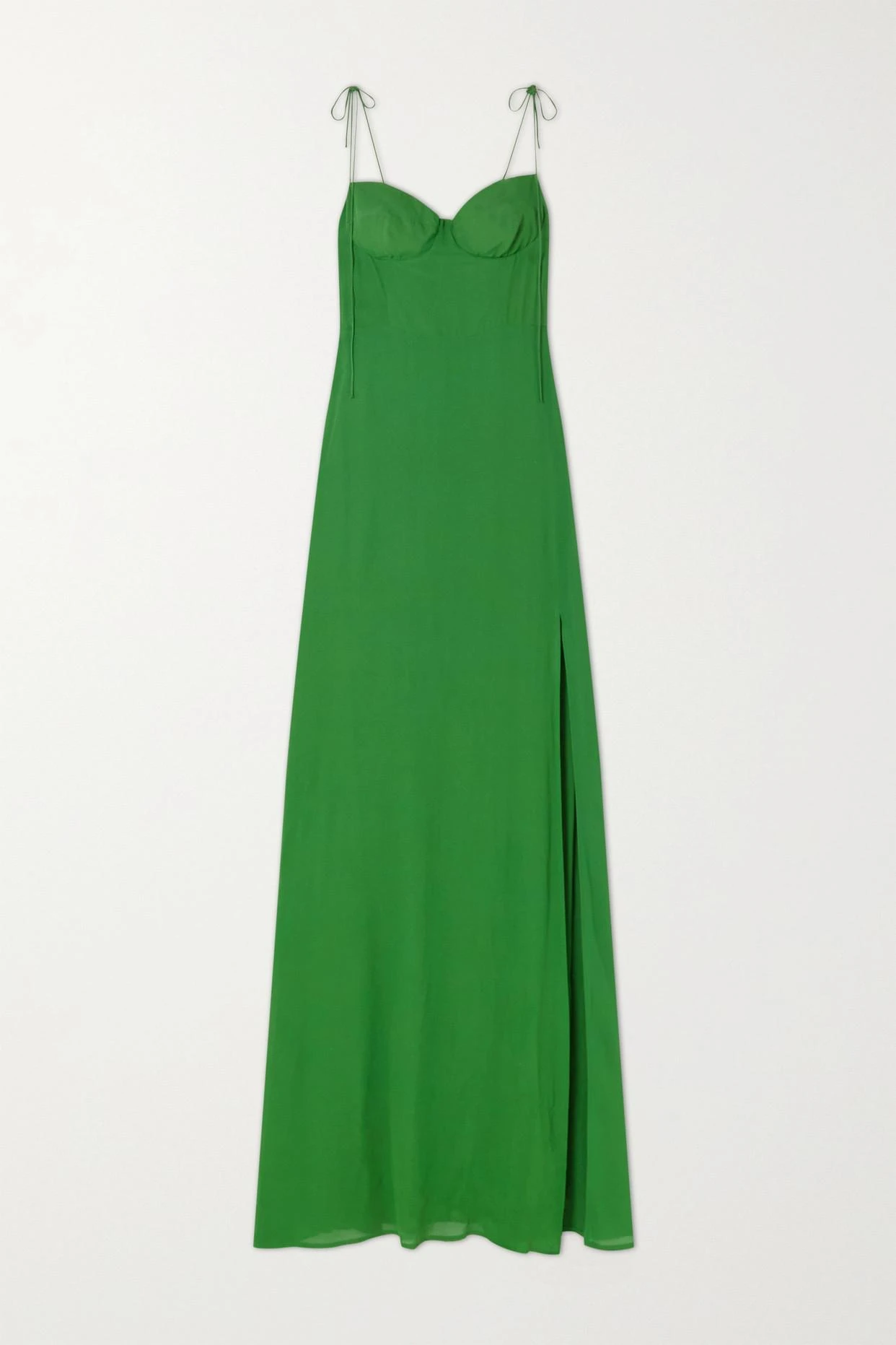 It should come as no surprise that Reformation started as a vintage store, its pieces are so timeless. This ‘Melita’ dress is cut from crepe de chine with a fitted bodice and smocked back for a comfortable fit. The floor-length hem features a chic side slit. Add a pair of strappy heels for a little extra height. Colour: green