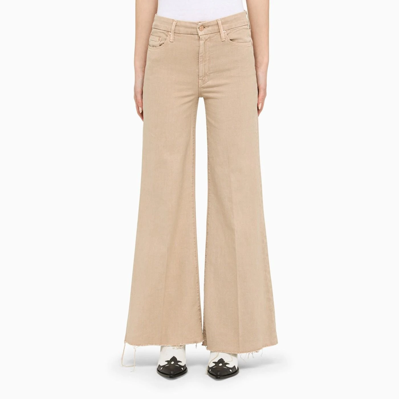 Beige cotton blend flared jeans by Mother, featuring three front pockets, two back pockets and frayed hem. Model wears size 26 Model measurements: Height: 178 cm Chest: 80 cm Waist: 60 cm Hips: 87 cm. 58% Cotton – 40% Lycra – 2% Elastane. Colour: natural