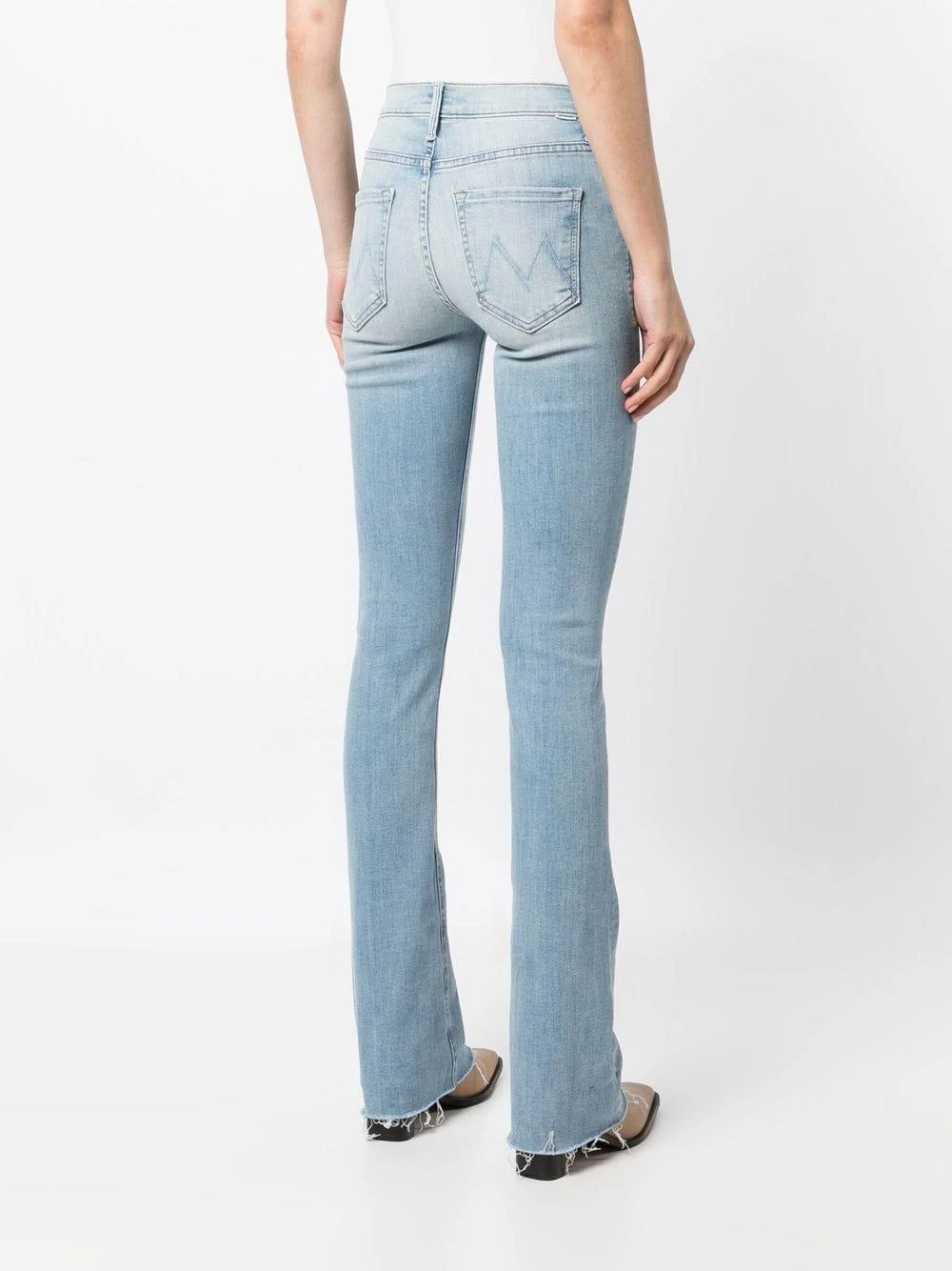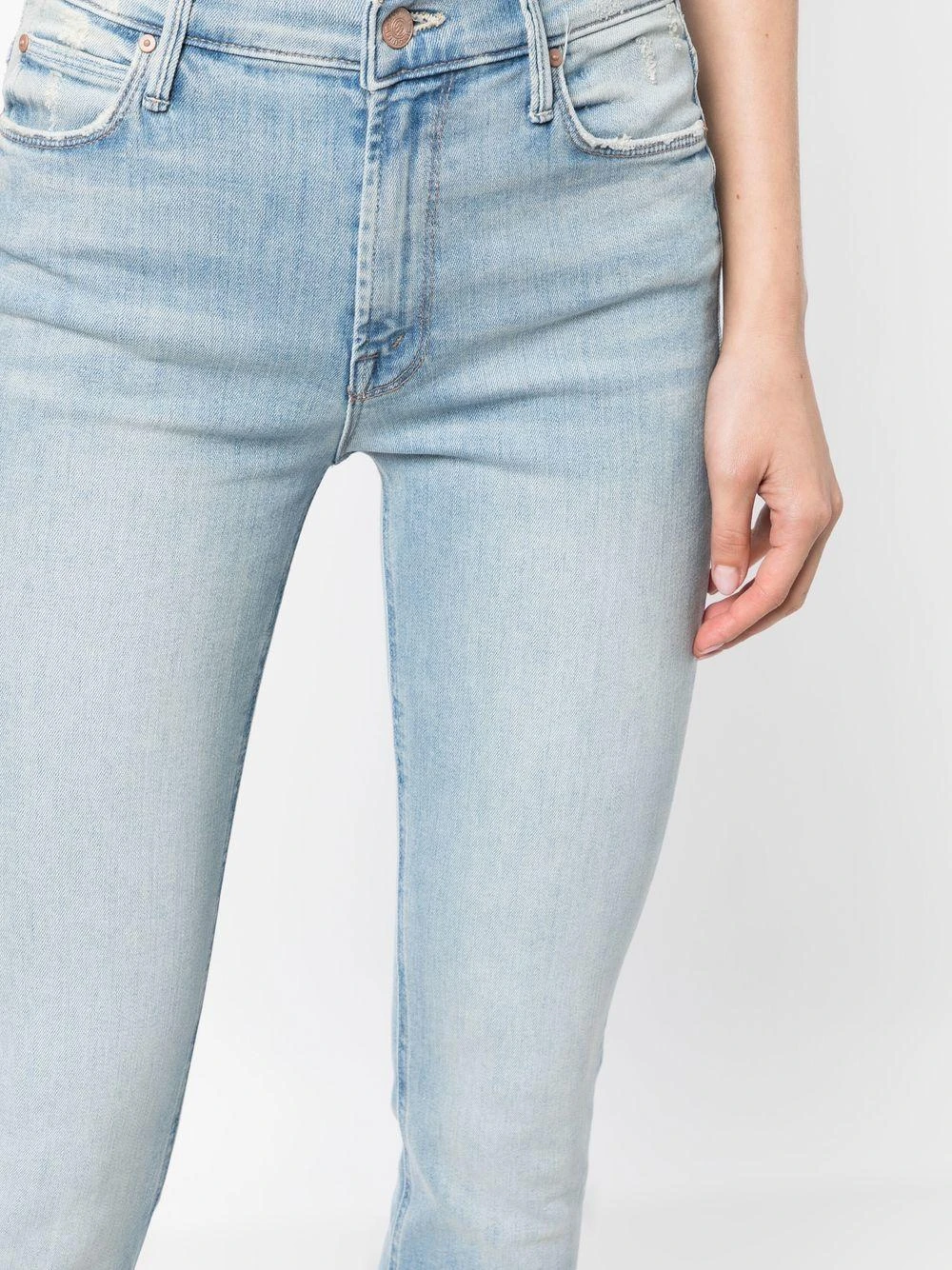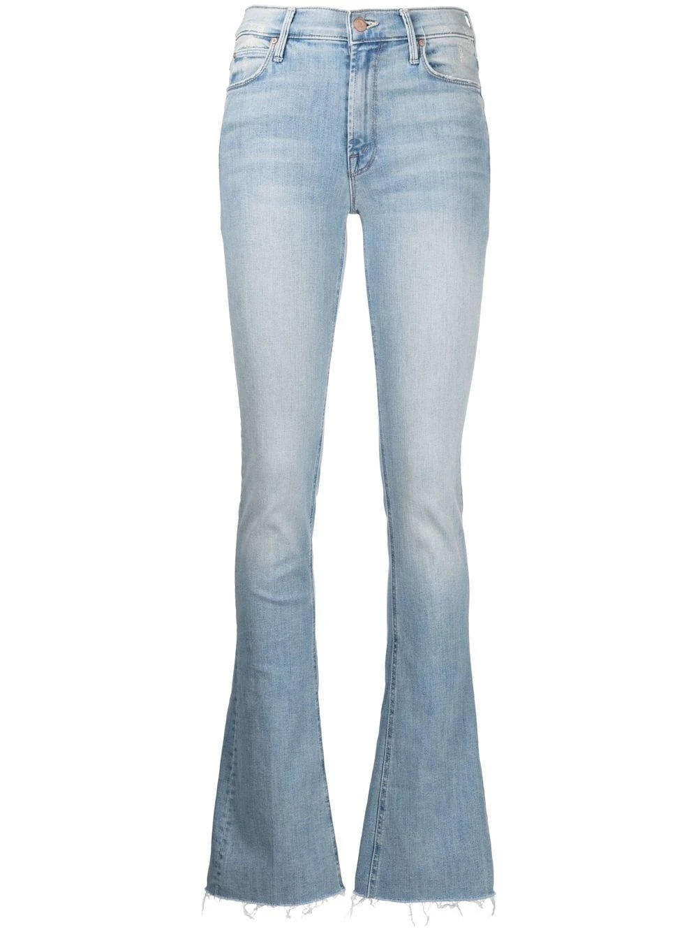 High-waisted bootcut jeans from MOTHER featuring light blue, stretch-cotton, belt loops, front button and zip fastening, classic five pockets, bootcut and raw-cut hem. Colour: blue
