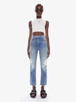 No joke. The perfect high-waisted straight leg jeans with an ankle-length inseam and a clean hem. Cut from semi-rigid superior denim, lol is a limited-edition mid-blue wash with fading, whiskering, paint splatters and bleaching all done by hand. These jeans are rigid and take time to break in. Mother says patience is a virtue. Made in los angeles. Colour: blue