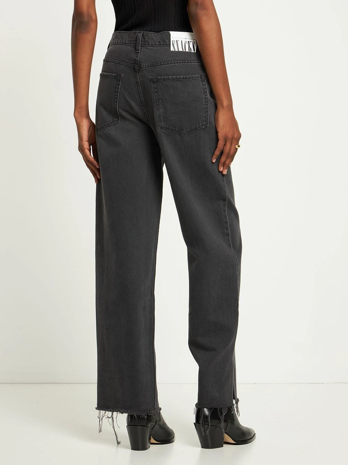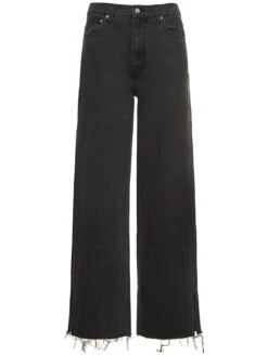 Front button and concealed zip closure. Belt loops. Slit cuffs at hem. Intentionally distressed effect may vary. Five pockets. Model is wearing a size26. Colour: black
