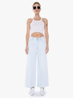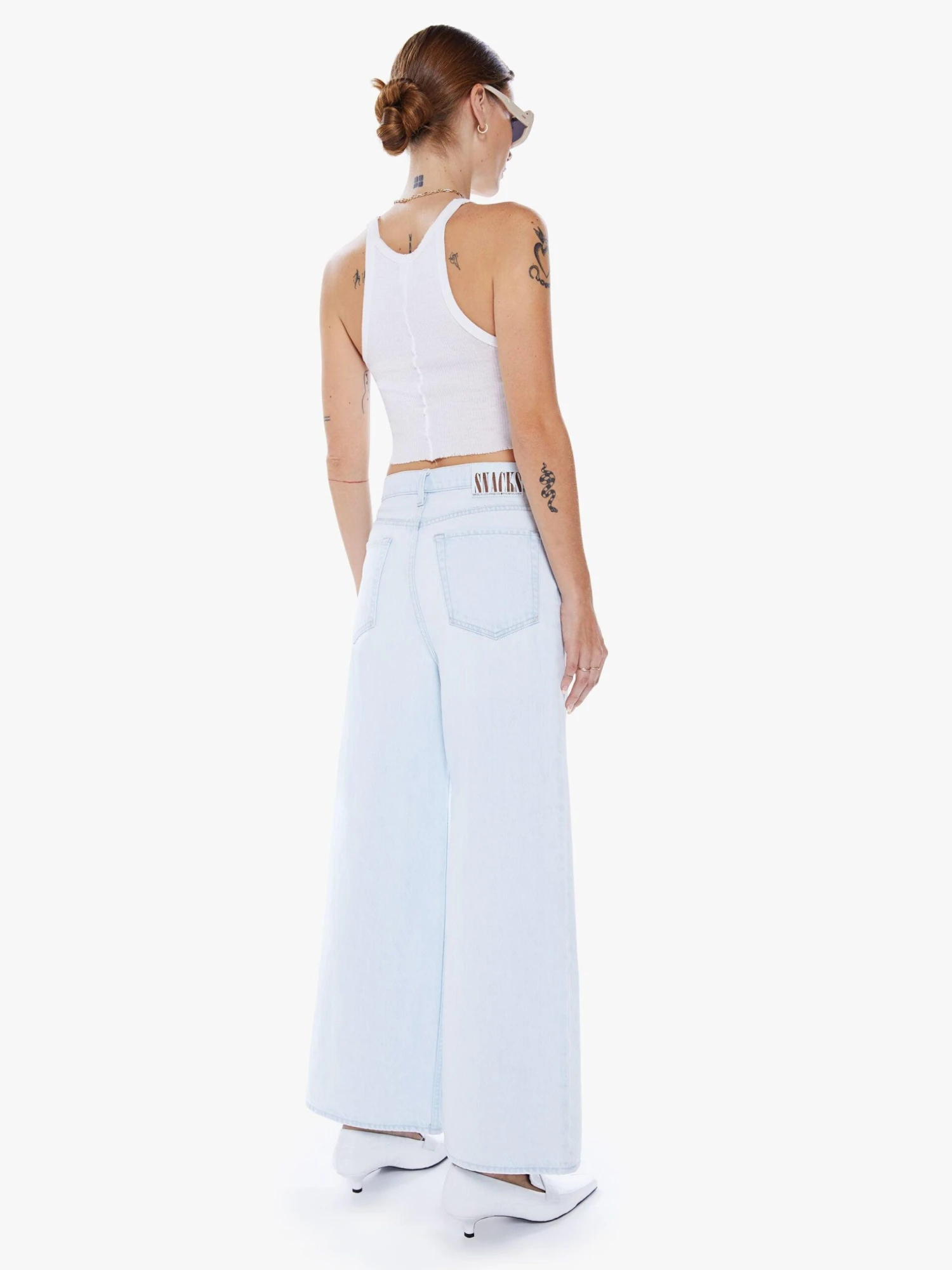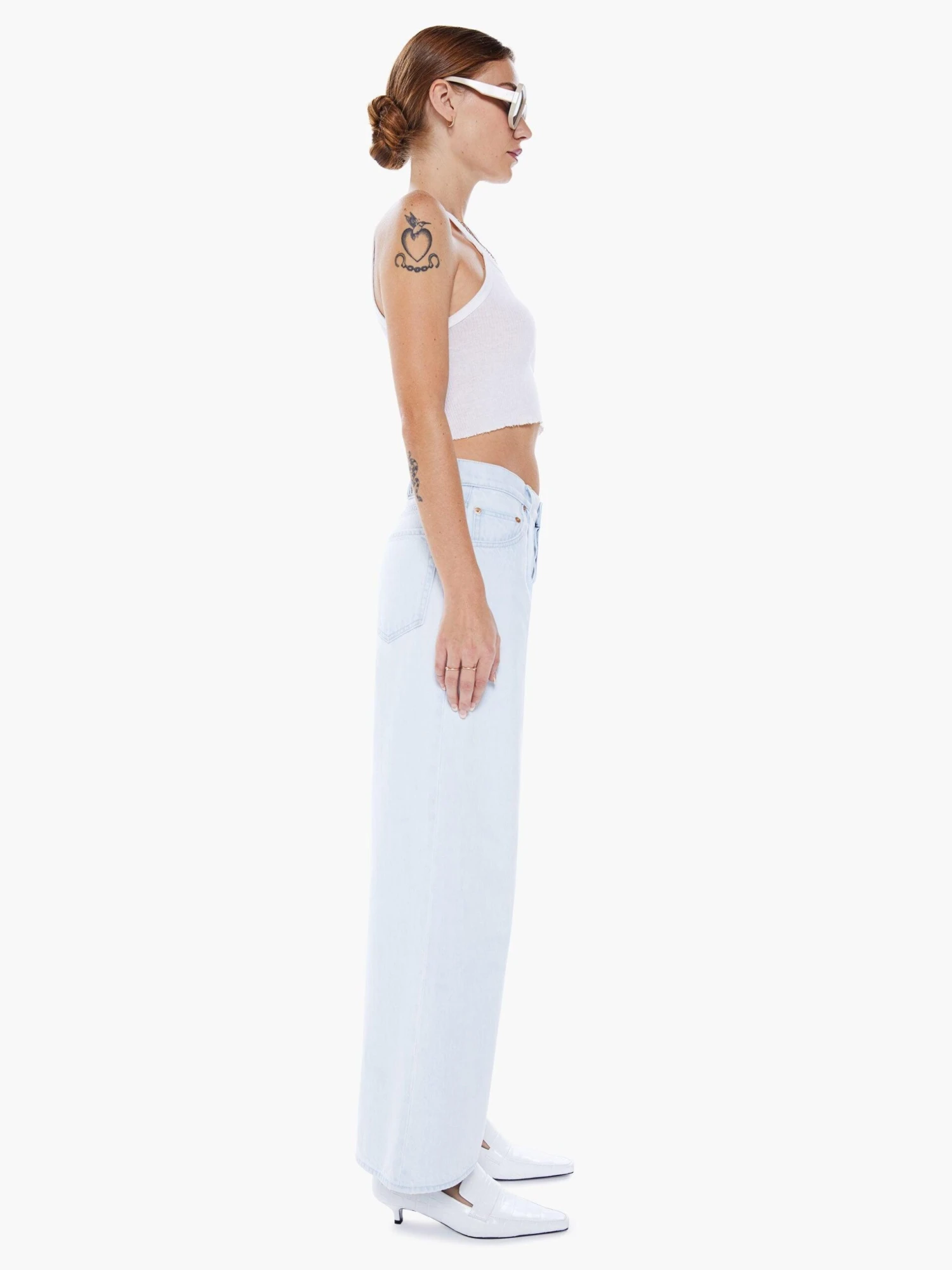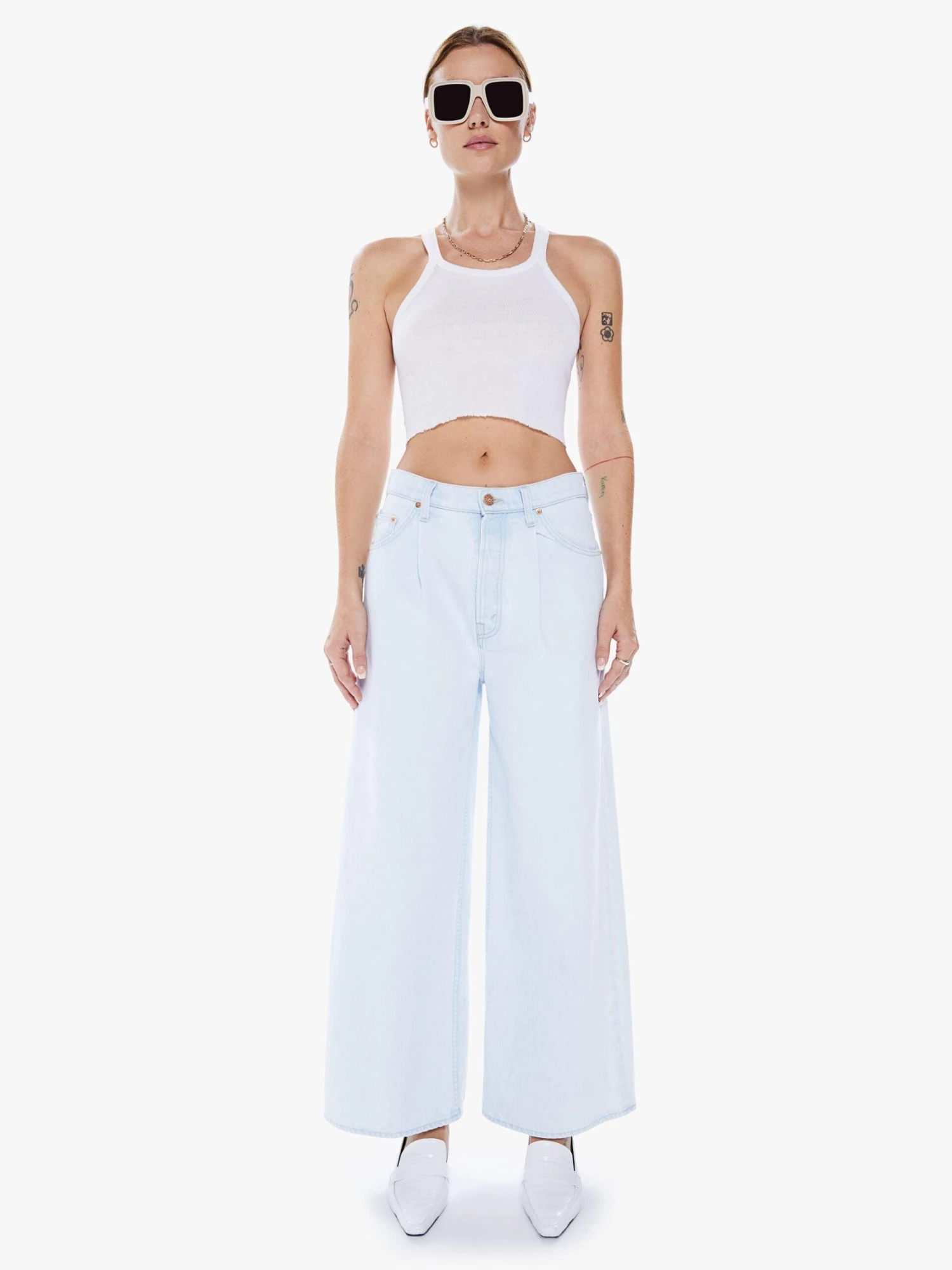 Have a ice day. A wide-leg jean from snacks! Mother’s homage to throwback styles of the 80s and 90s. Designed to be worn high, the jeans feature a button fly, front pleat for an even roomier fit and an ankle-length inseam. Made from rigid 100% cotton, blue slushie is a faded light-blue wash that channels the nostalgia of snack time with a pretzel-detailed button and candy-inspired interior rivets. These jeans are rigid and take time to break in. Mother says patience is a virtue. Made in los angeles. Colour: white