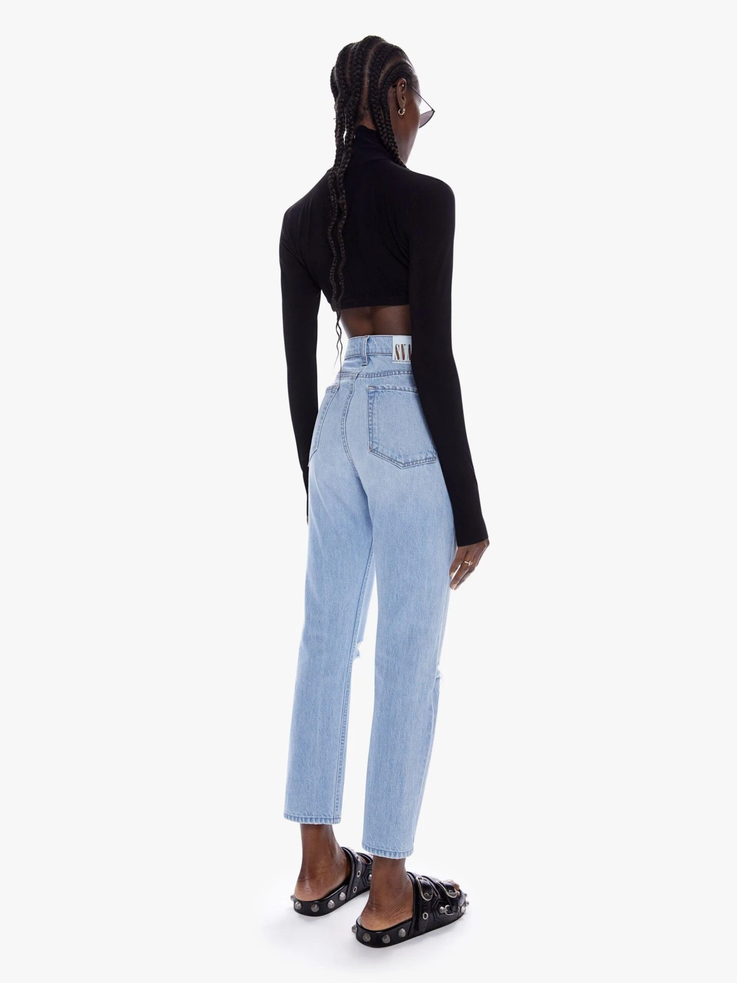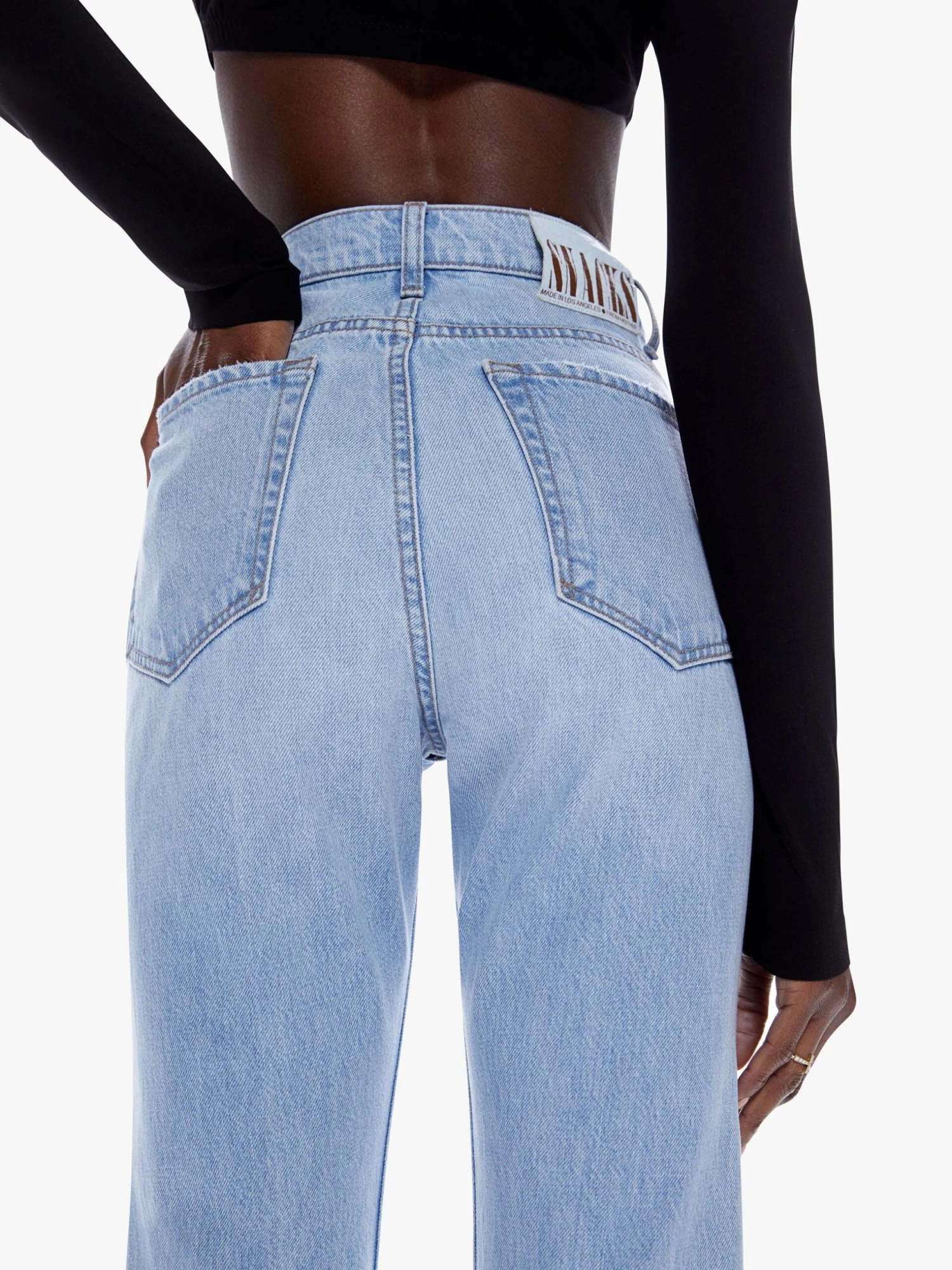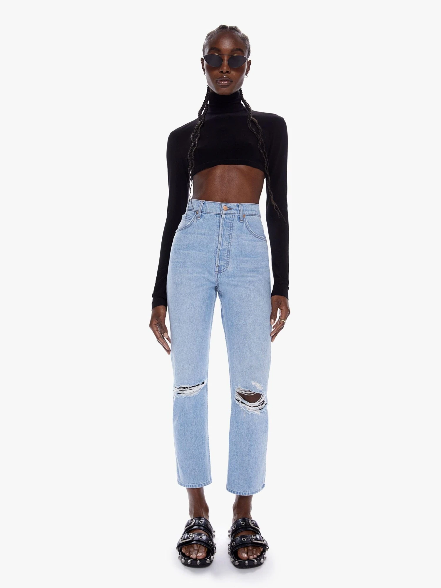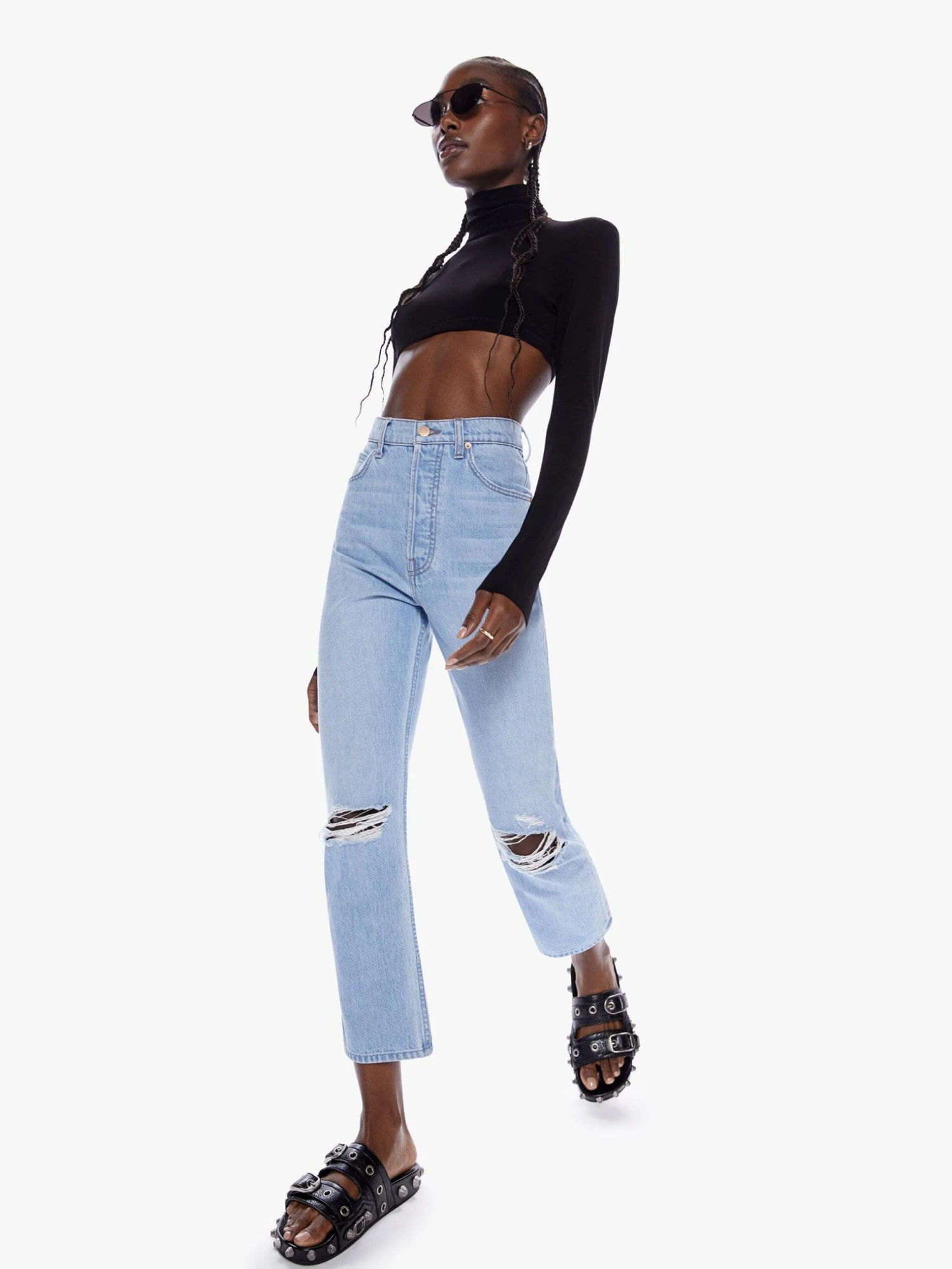 Just can’t get enough. A straight-leg jean from snacks! Mother’s homage to throwback styles of the 80s and 90s. The super high-waisted jeans feature a narrow straight leg with a clean ankle-length inseam. Made from rigid 100% cotton, lots of nibbles is a vintage blue wash with tears at the knees that channels the nostalgia of snack time with a pretzel-detailed button and candy-inspired interior rivets. These jeans are rigid and take time to break in. Mother says patience is a virtue. Made in los angeles. Colour: blue