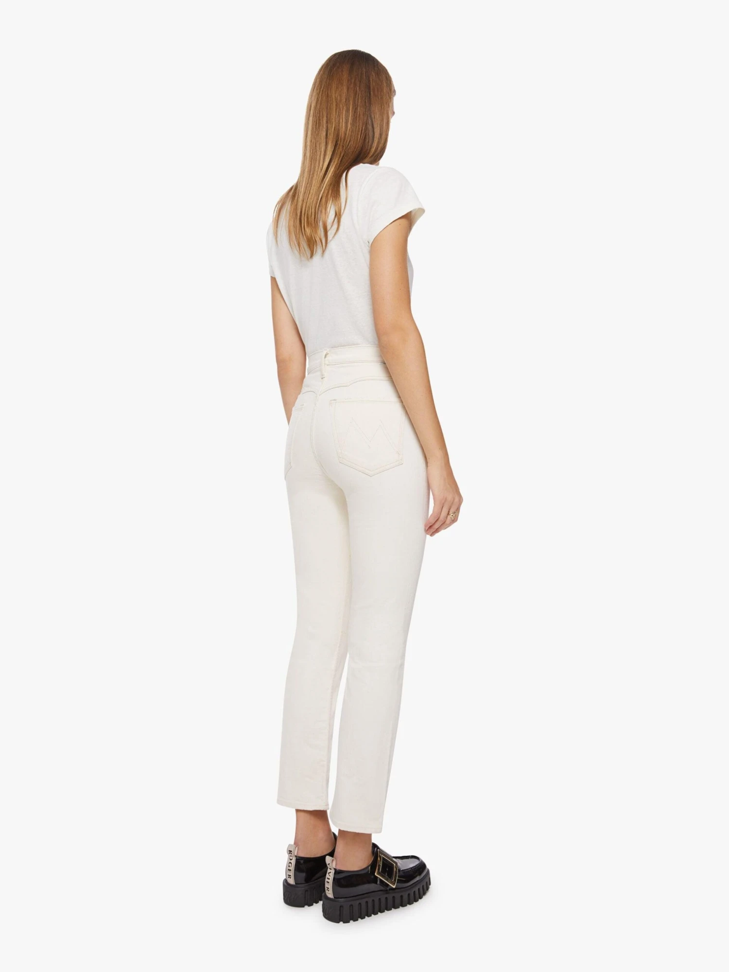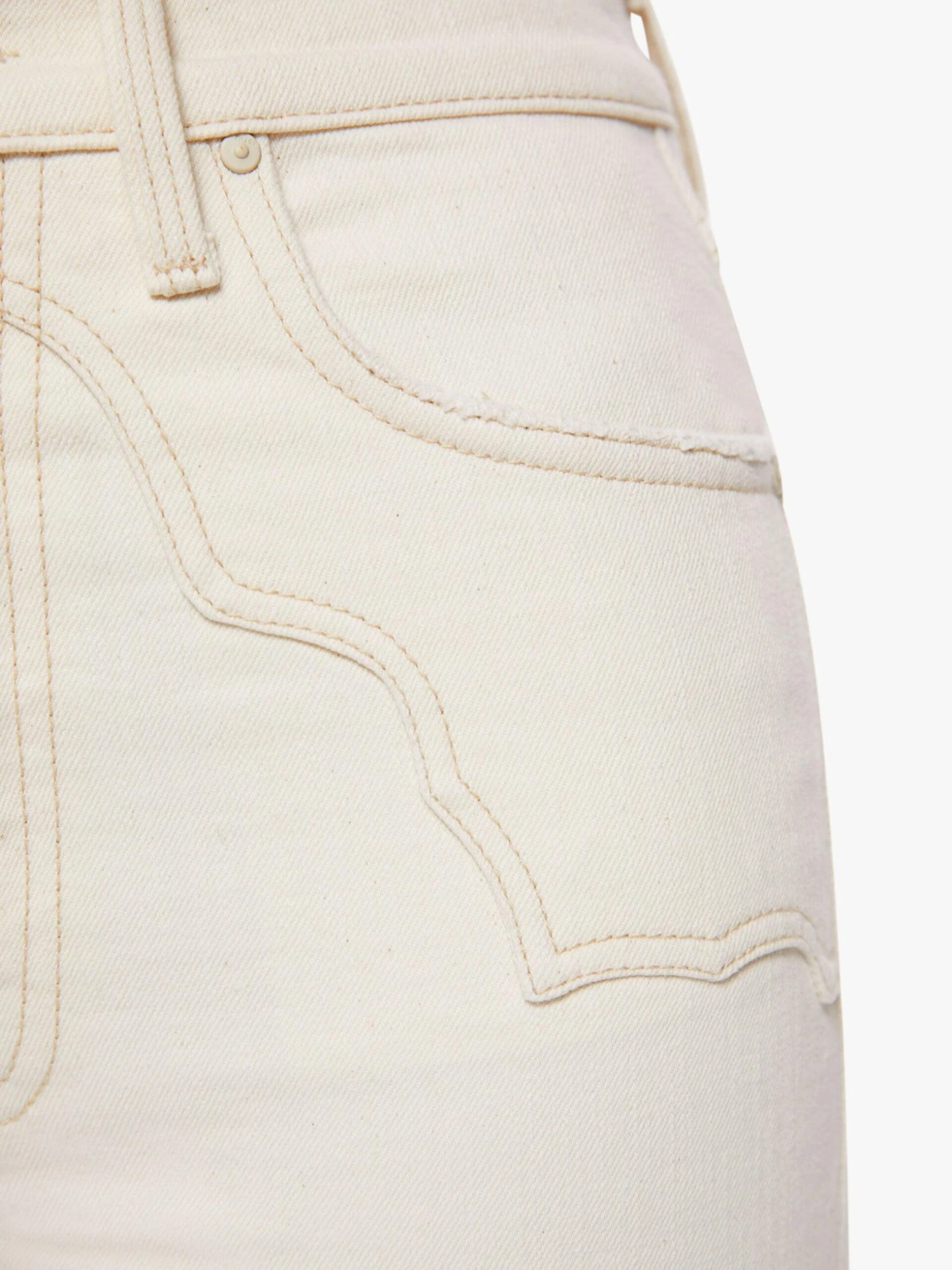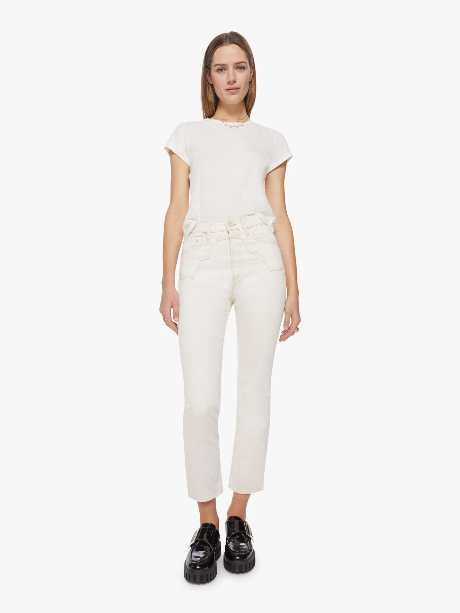 Au naturel. A high-rise straight leg with western-inspired yoke details at the waist, an ankle-length inseam and a clean hem. Crafted from semi-rigid superior denim, act natural is a creamy white hue with tonal hardware for a monochrome look. These trousers are rigid and take time to break in. Mother says patience is a virtue. Made in los angeles. Colour: white