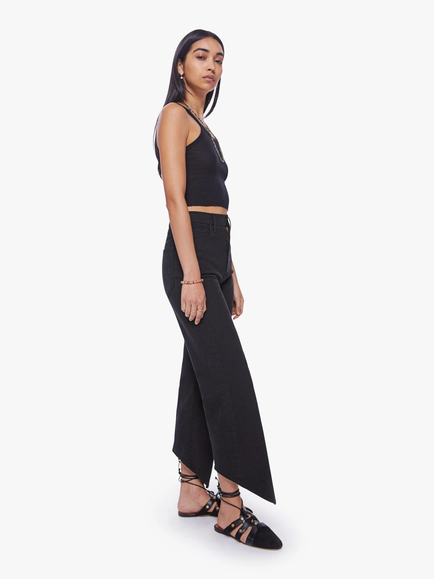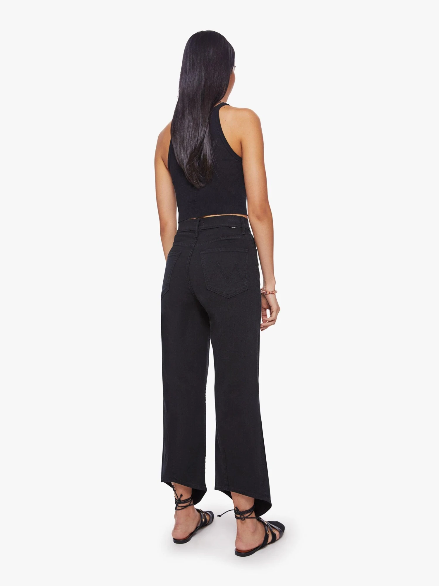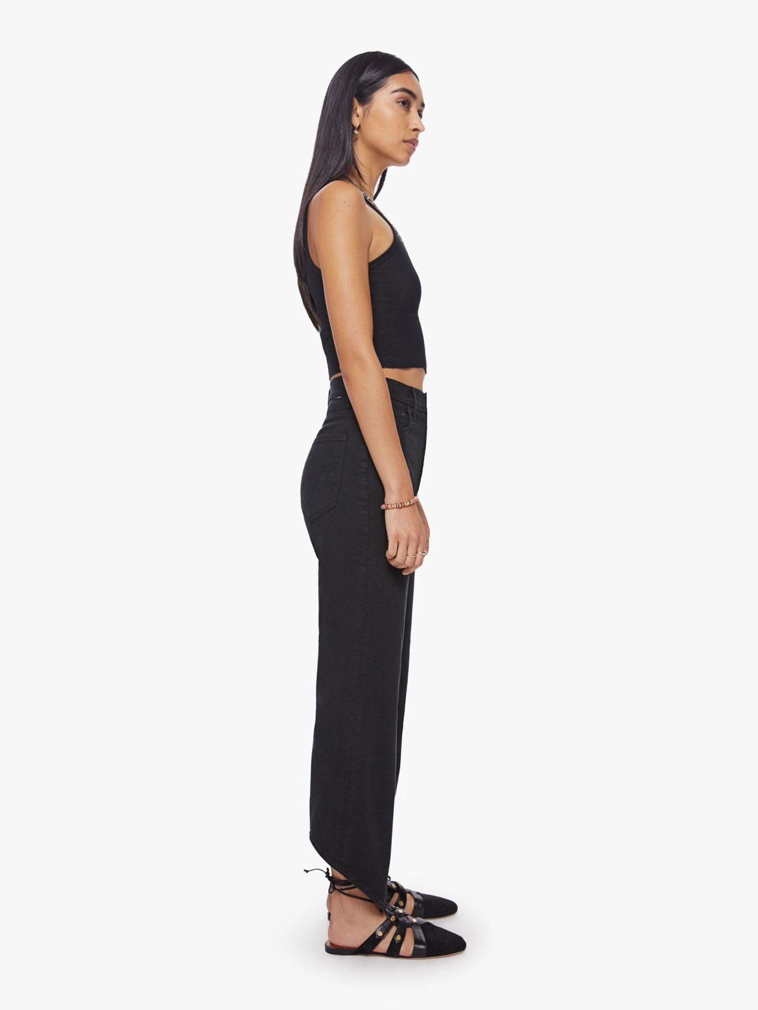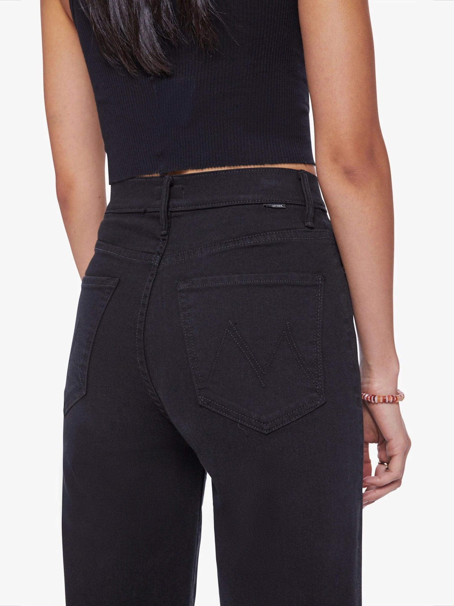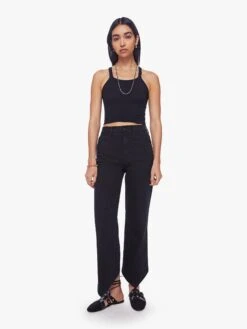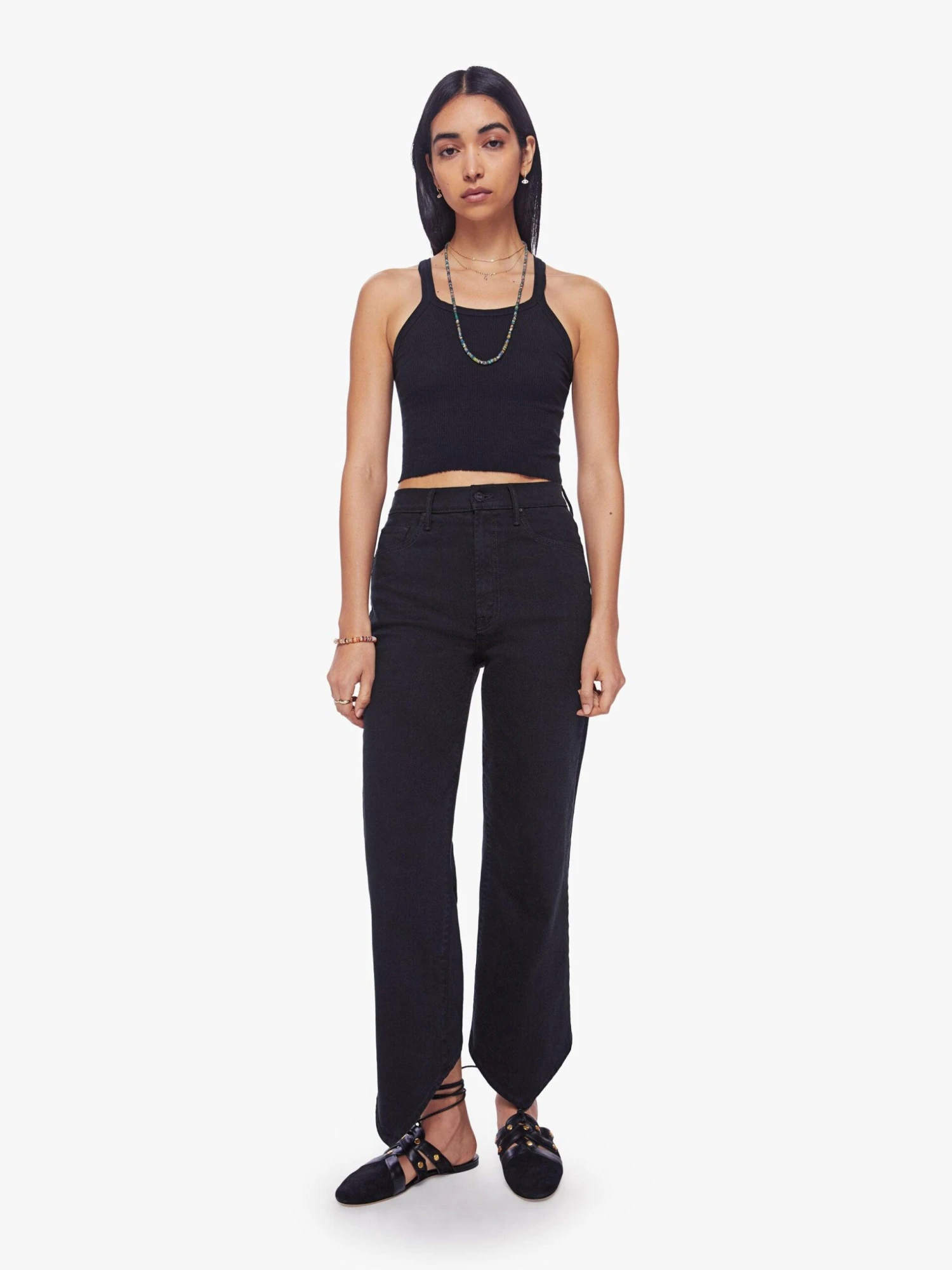 Let your mind go blank. Super high-waisted straight-leg jeans with a v-shaped front hem and a shorter hem in the back. Made from a recycled denim blend with a touch of stretch, pitch is a solid black hue with tonal hardware. Pair it with a matching cropped tank and meditative thoughts. Made in los angeles. Colour: blue