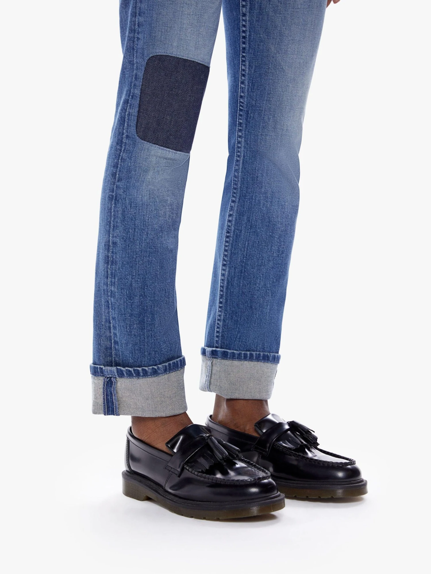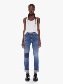 One for the road. One of mother’s original straight-leg jeans with a high rise and a cuffed ankle-length inseam. Cut from semi-rigid superior denim, beer me is a mid-blue wash with fading, whiskering and a patch just above the knee. These jeans are rigid and take time to break in. Mother says patience is a virtue. Made in los angeles. Colour: blue