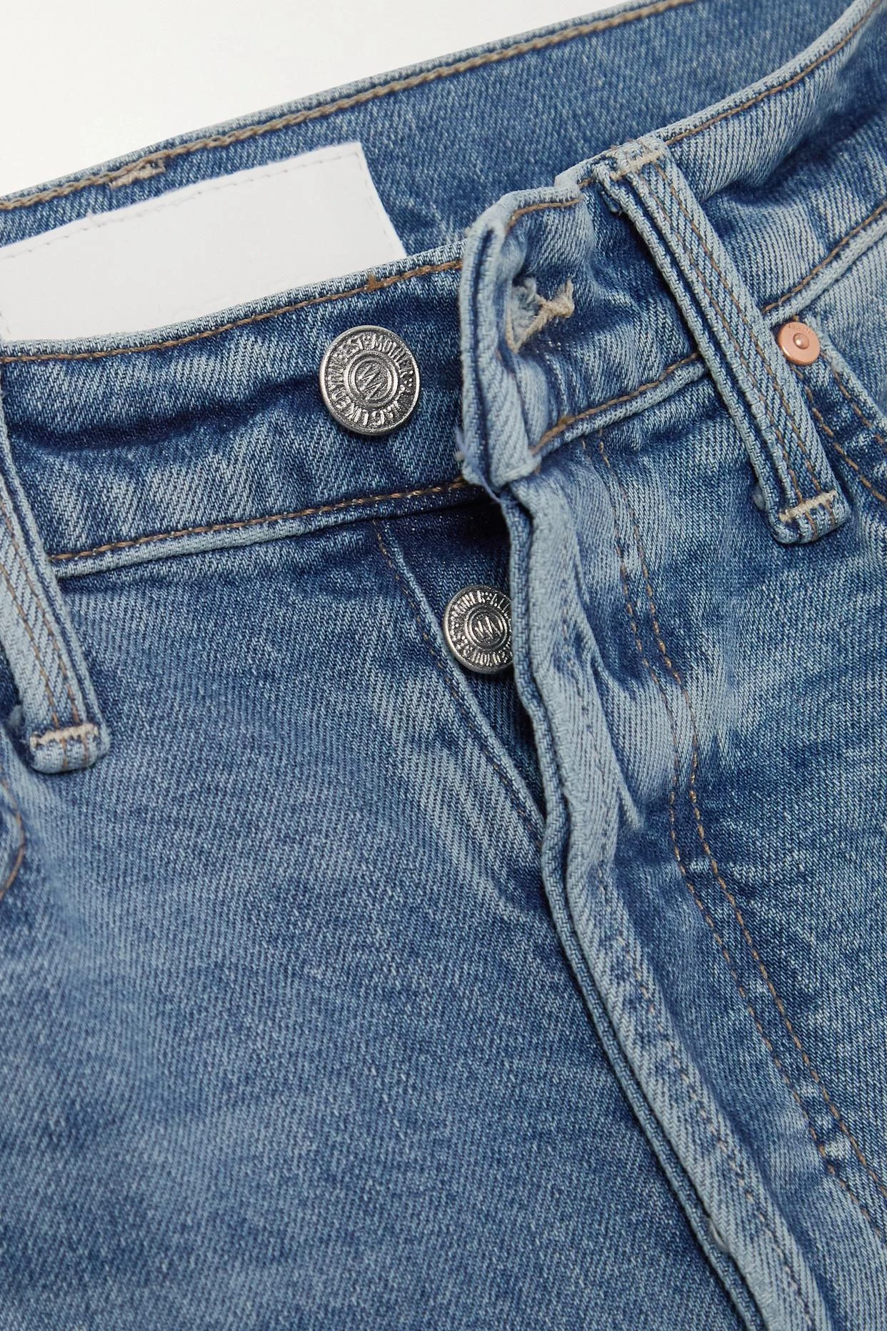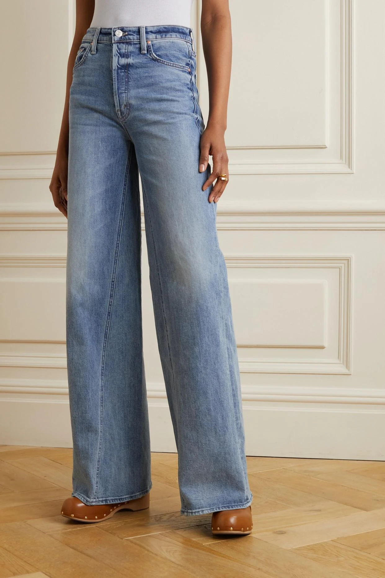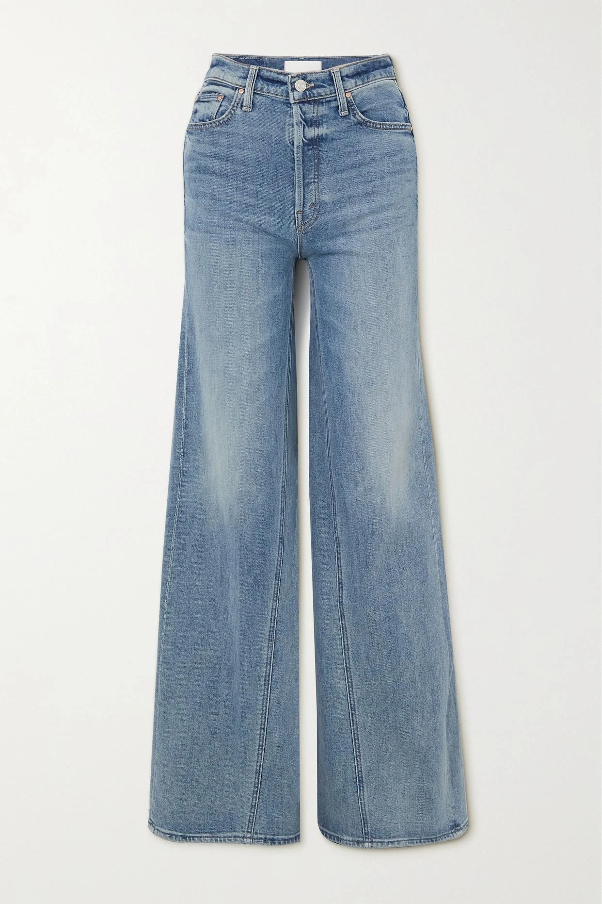MOTHER’s ‘The Enchanter Heel’ jeans are made from rigid blue denim, which the label says “take time to break in. They sit high on the waist and have an exaggerated wide silhouette with faded knees.