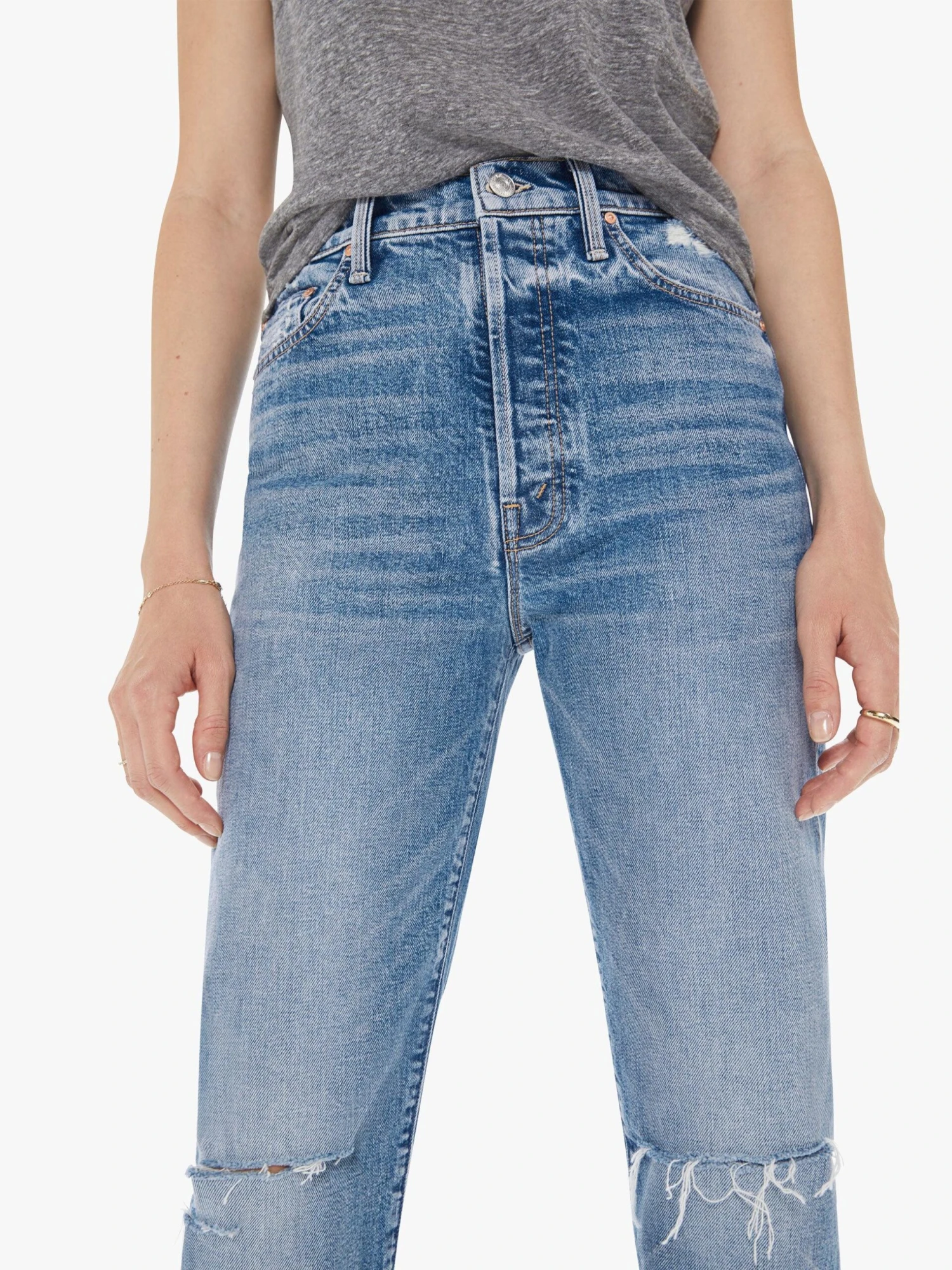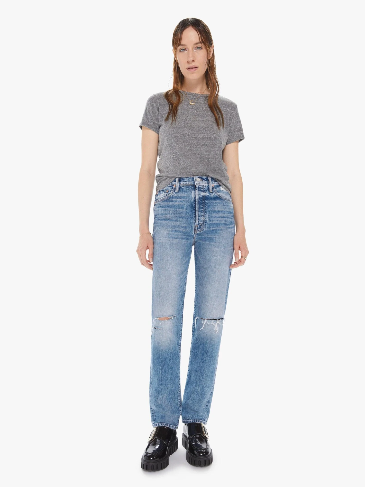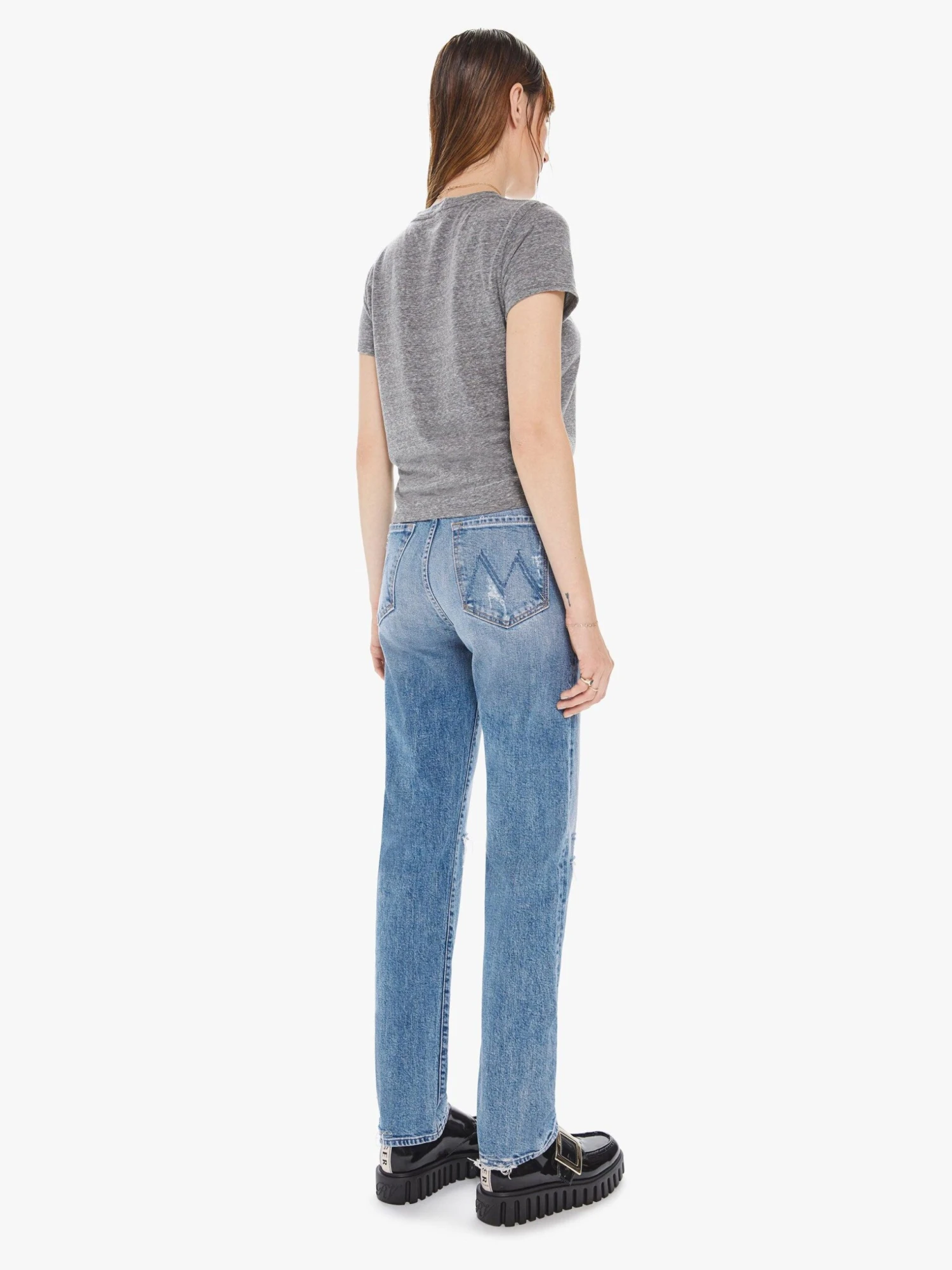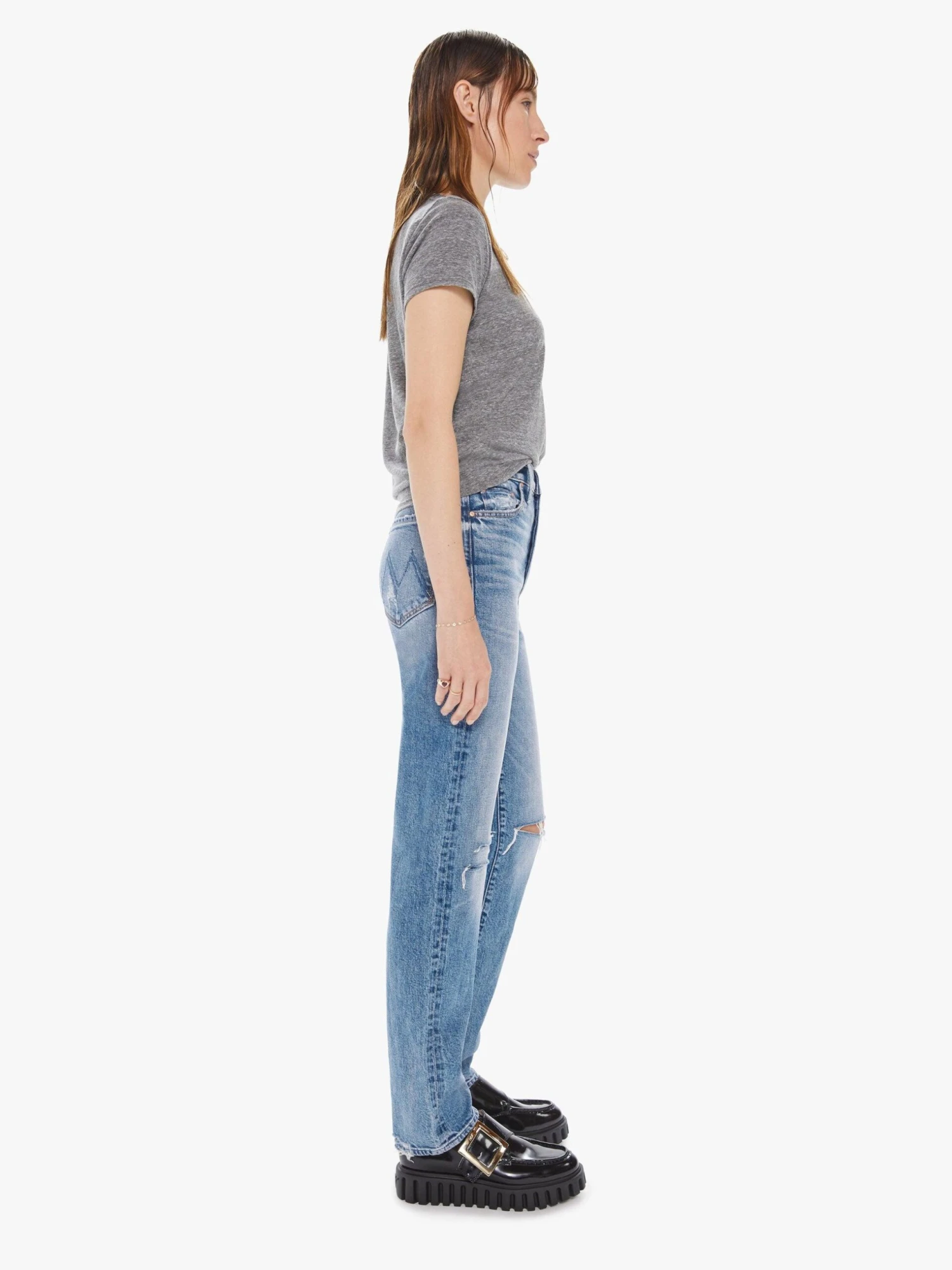 A high-waisted straight leg with a long 31-inch inseam and a loose fit. Cut from semi-rigid superior denim, belle de nuit is a mid-blue wash with high-contrast fading, whiskering, tears at the knees and distressed details. These jeans are rigid and take time to break in. Mother says patience is a virtue. Made in los angeles. Colour: blue