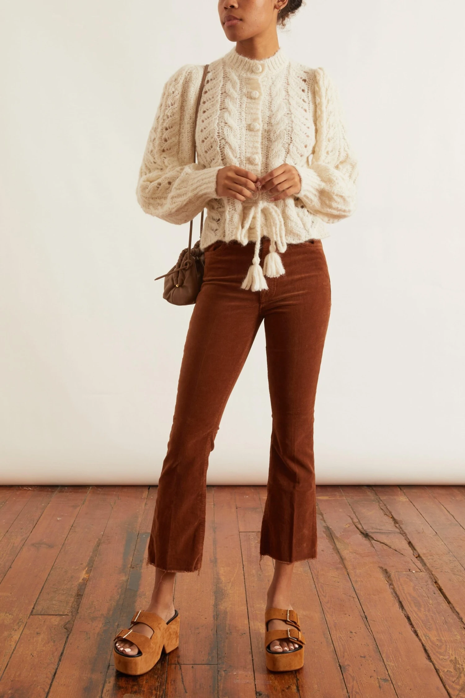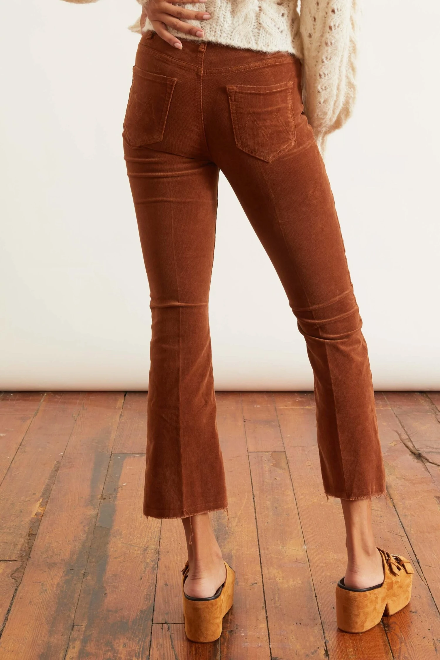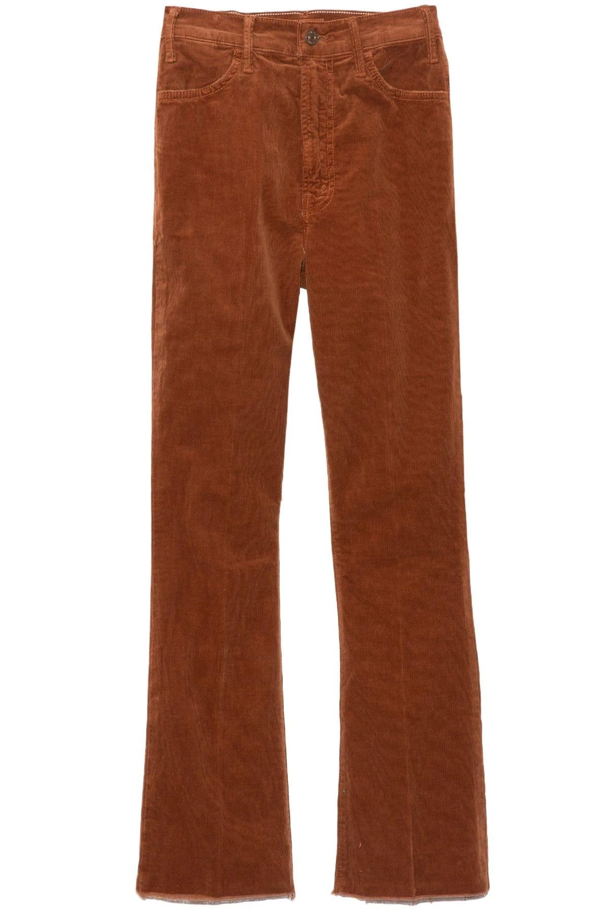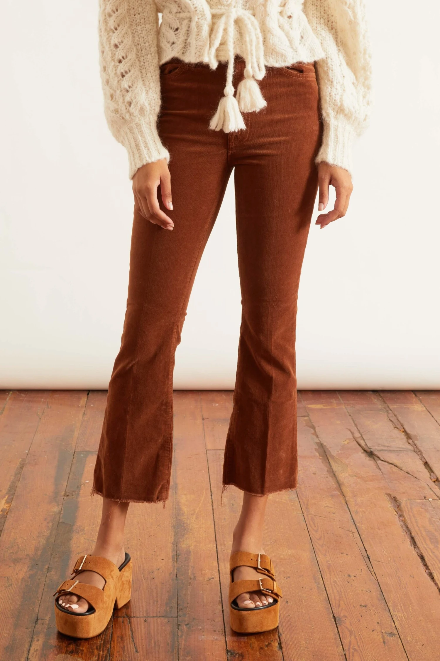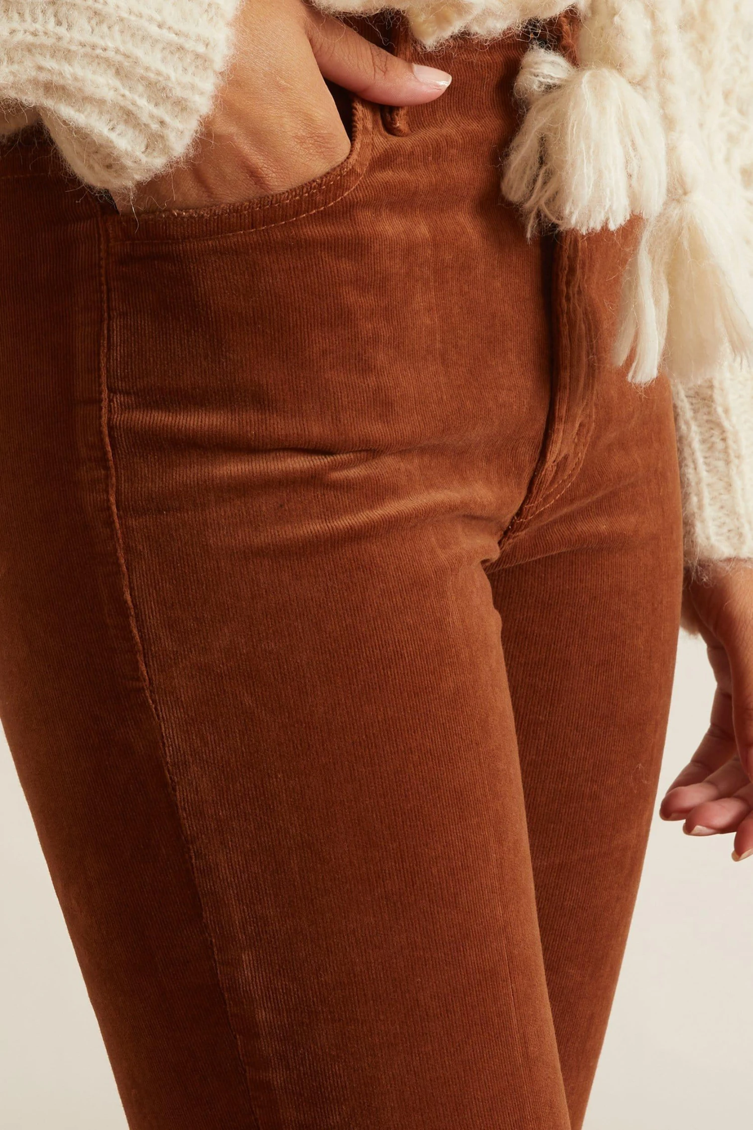 Grounded. This bestselling high-rise flare has an ankle-length inseam and a raw hem. It’s cut from soft corduroy in an earthy tone. Made in Los Angeles. Stretchy. High Rise. Bootcut. Ankle Length. 11″ Rise. 27 1/2″ Inseam. 16″ Leg Opening. Brown Wash. Zip Fly. Frayed Hem. 93% Cotton 6% Polyester 1% Elastane. Fits true to size, take your normal size. Model is 5’10” and is wearing a size 0. Colour: brown