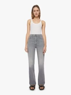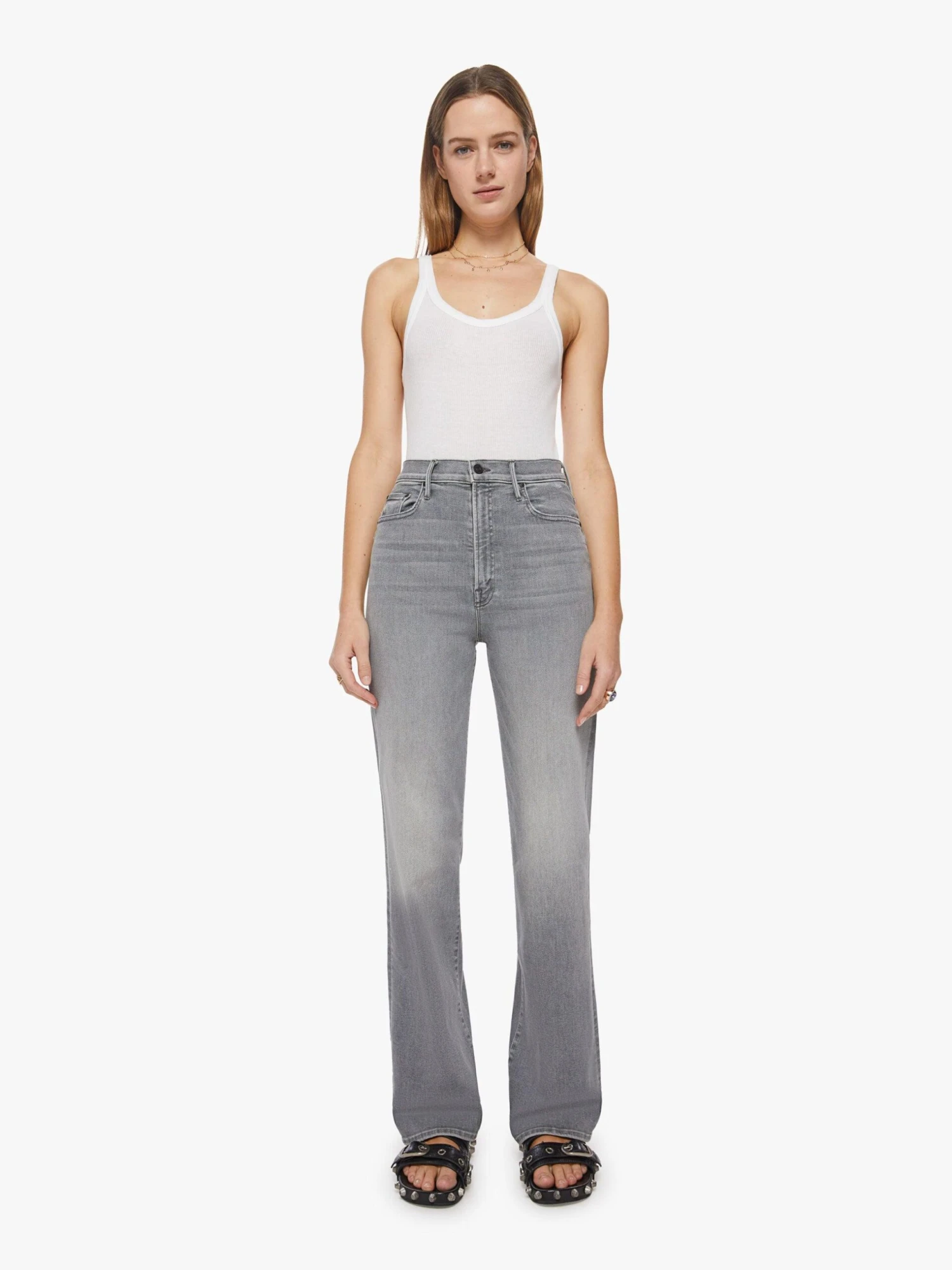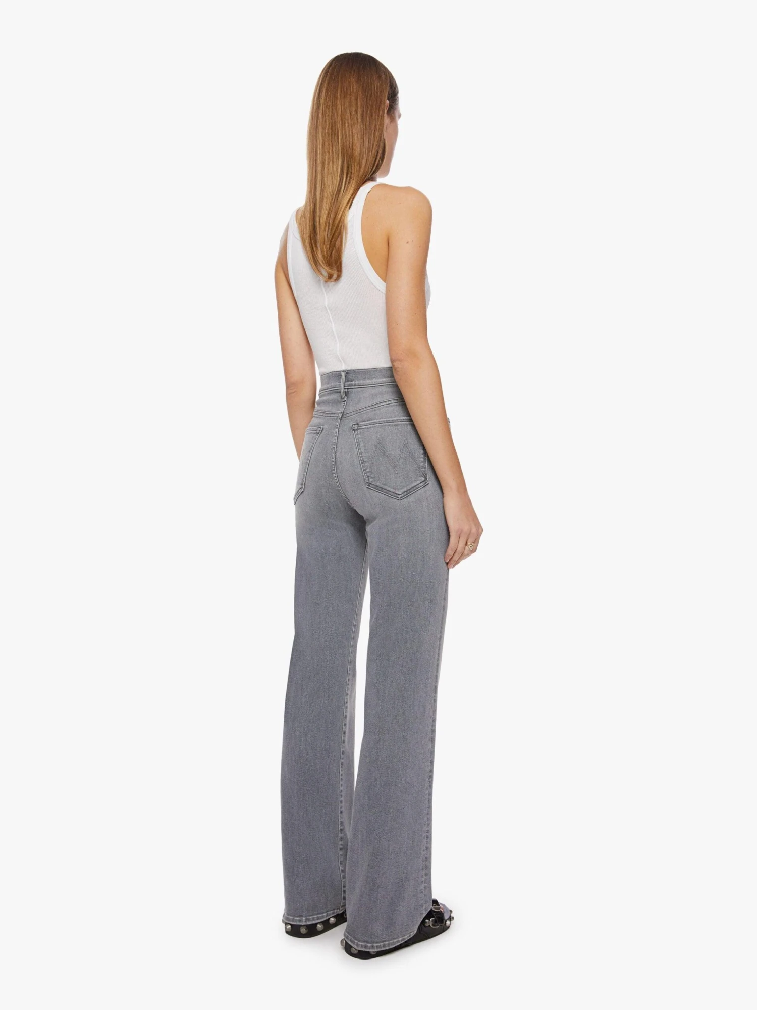 Super high-waisted jeans with a loose fit, wide leg and 35-inch inseam with a clean hem. Made from stretch denim, barely there is a washed grey hue with fading, whiskering and black hardware. This style runs big. Mother suggests sizing down one size. Made in los angeles. Colour: white