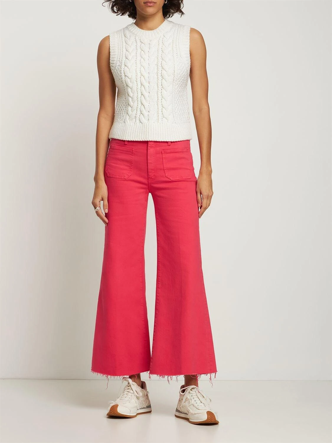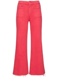 Front button and concealed zip closure. Belt loops. Raw cut cuffs at hem. Two front patch pockets. Two back patch pockets. Model is wearing a size26. Colour: red