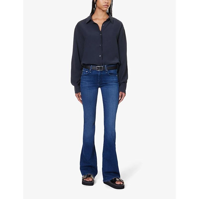 If you’re a denim fanatic, you’ve probably noticed that styles are straying from skinny silhouettes and, instead, favouring more room through the legs. Recognising the shift, MOTHER dreams up The Weekender jeans with a difference. While they’re slim fitting through the thigh, they open out past the knees with a kick flare hem that’s neatly stitched for a clean finish. A subtly faded wash and whiskering add to the authenticity of their vintage silhouette. MOTHER cotton-blend jeans64% cotton, 22% recycled cotton, 13% polyester, 1% elastaneButton and zip-fly fasteningFitted, high rise, flared leg, belt loops, five pockets, dark wash, brand patch at back waistband, V-shaped yoke at backDry cleanTrue to sizeSize 26: rise 9in / 23.5cm, inside leg 34in / 87cm, leg opening 20in / 51.5cmModel is 5ft 10in/1.78m and wears a size 26Midweight, slight stretch. Colour: blue