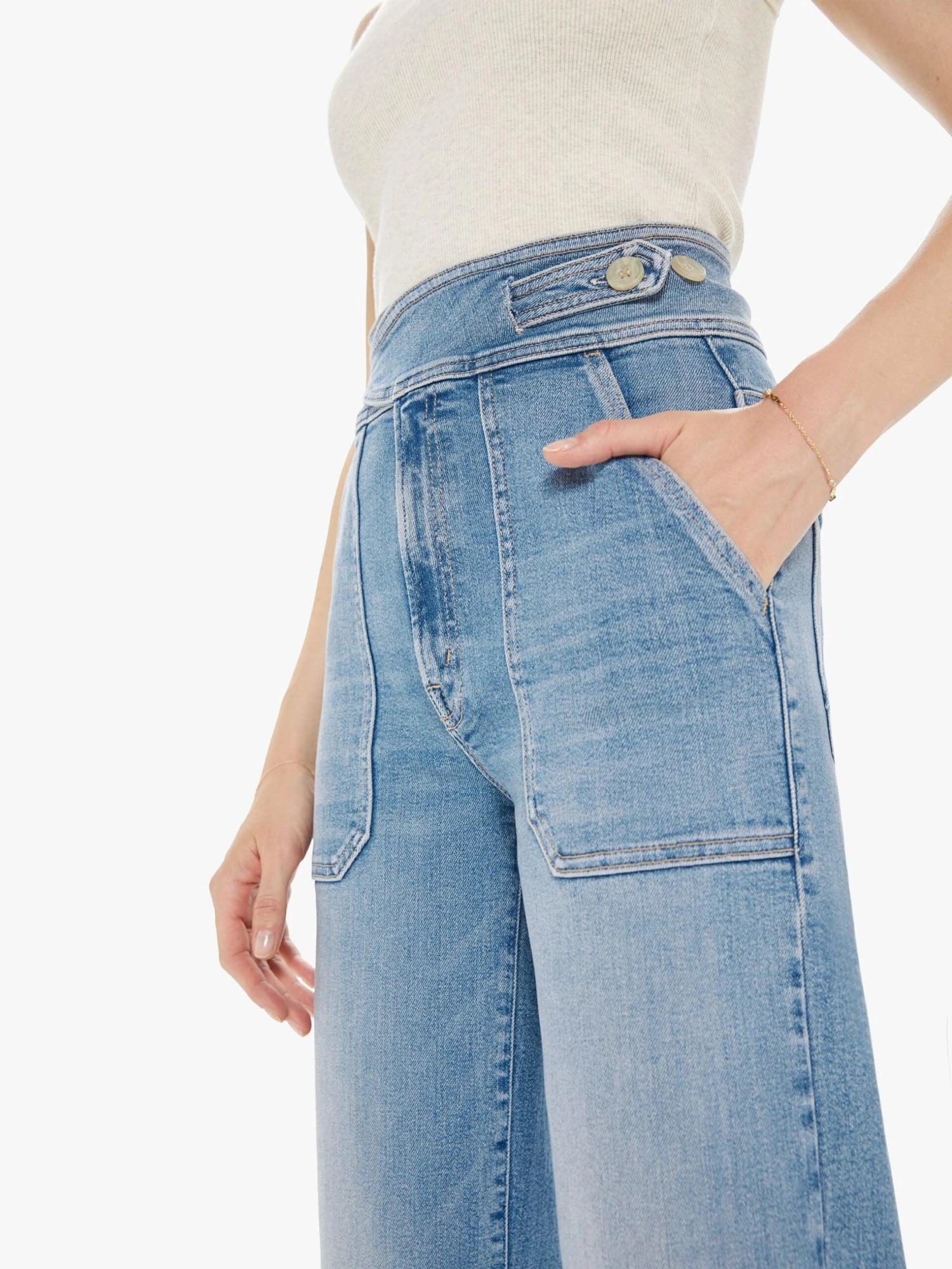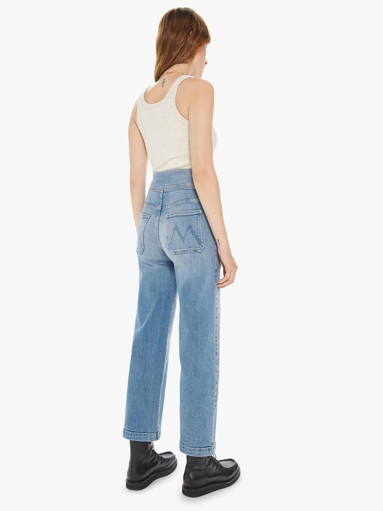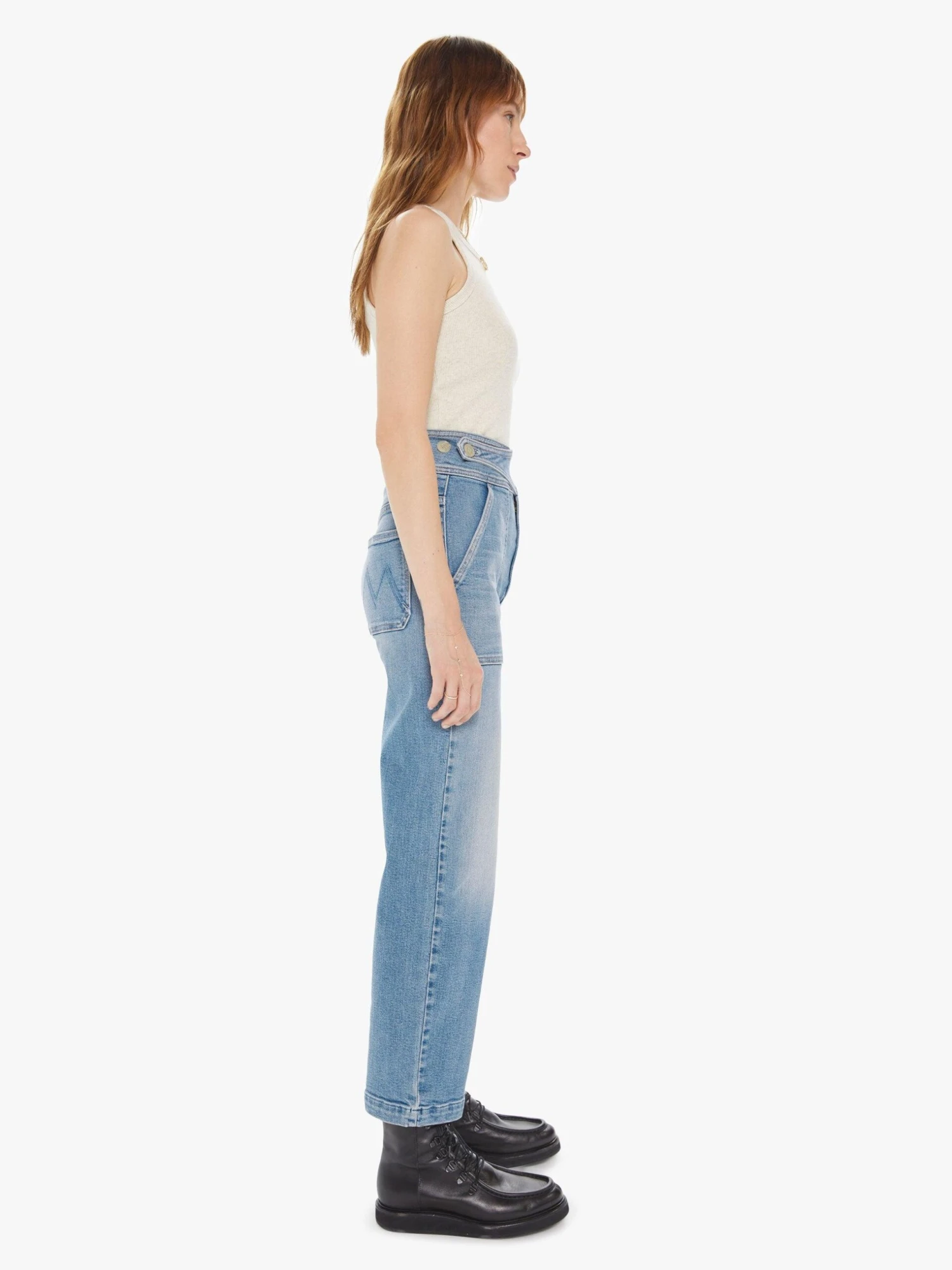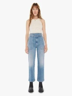 Wanna go for a ride? High-rise straight-leg jeans with a buttoned wrapped waistband, patch pockets and a clean ankle-length hem. Cut from stretch denim, let’s trip is a light blue wash with whiskering and fading and at the knees. No turning back now. Made in los angeles. Colour: blue