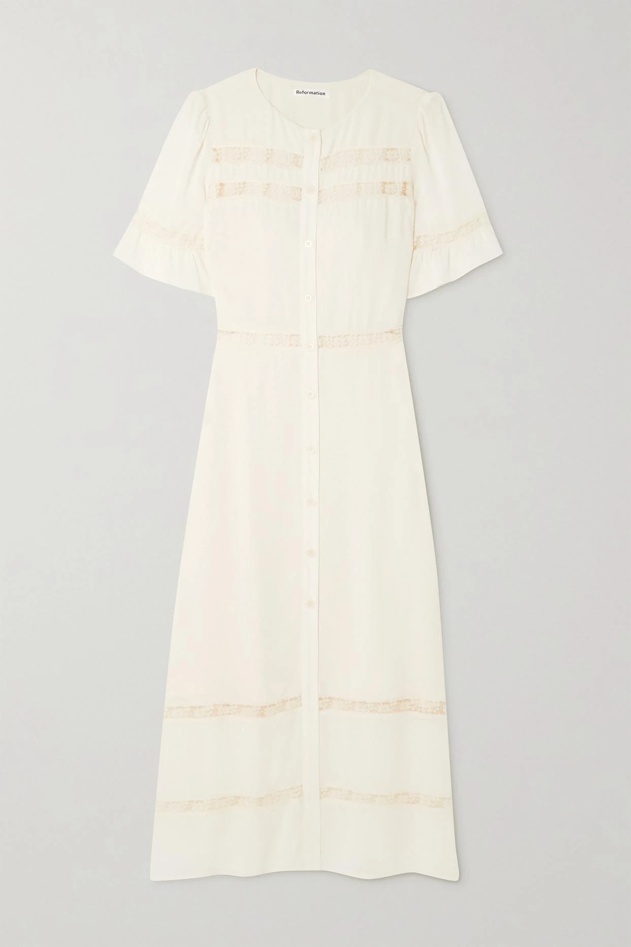 Reformation works with non-profit group Canopy to source its materials responsibly. The georgette fabric of this ‘Woodson’ dress is made using certified forest-friendly viscose that derives from wood pulp. A romantic choice for day or evening occasions, it’s trimmed with wispy lace to reveal glimpses of skin and has sweetly ruffled sleeves. Leave a few buttons undone to show your necklace. This product was created using Considered Materials. Find out more about NET SUSTAIN here.