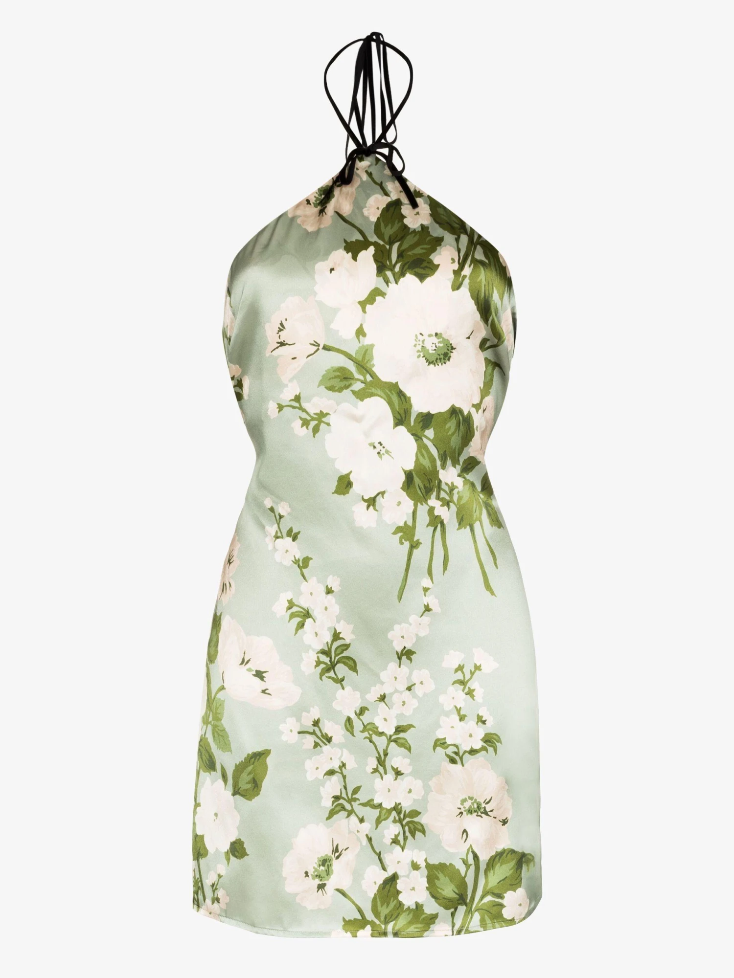 This green Reformation Poppie floral print silk mini dress is designed for a slim fit and has with adjustable shoulder straps. It features a black front bow, tie halterneck, an open back, concealed zip fastening and all-over white and green blooms. Robert Burns once wrote that ‘pleasures are like poppies spread. This Reformation dress is a testament to that because it brings us joy. Colour: green