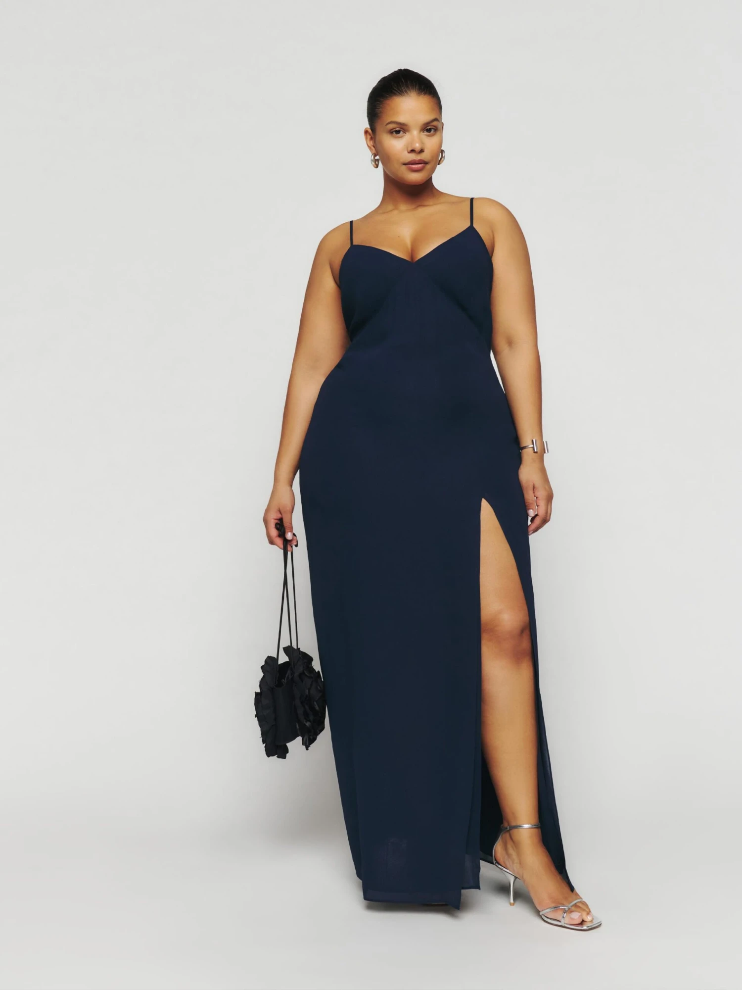 A little romance. The Pyper is a maxi dress with adjustable, spaghetti straps and a V-neckline. It’s fitted throughout with a high slit to show off some leg. Colour: blue