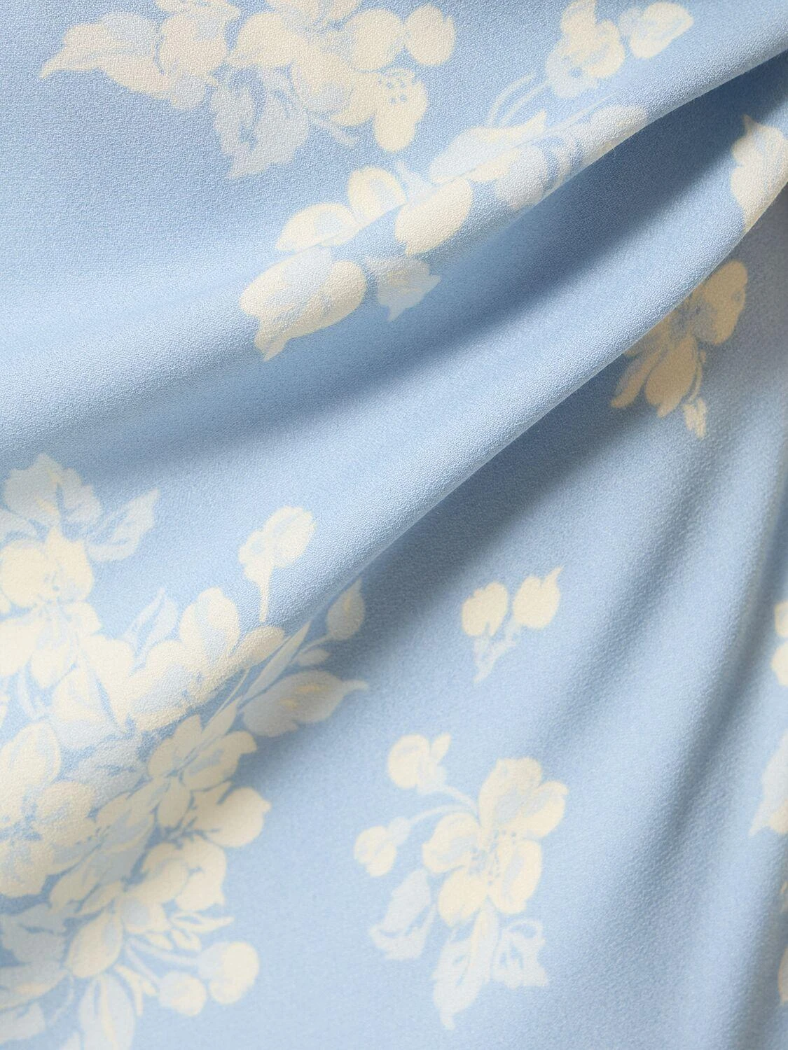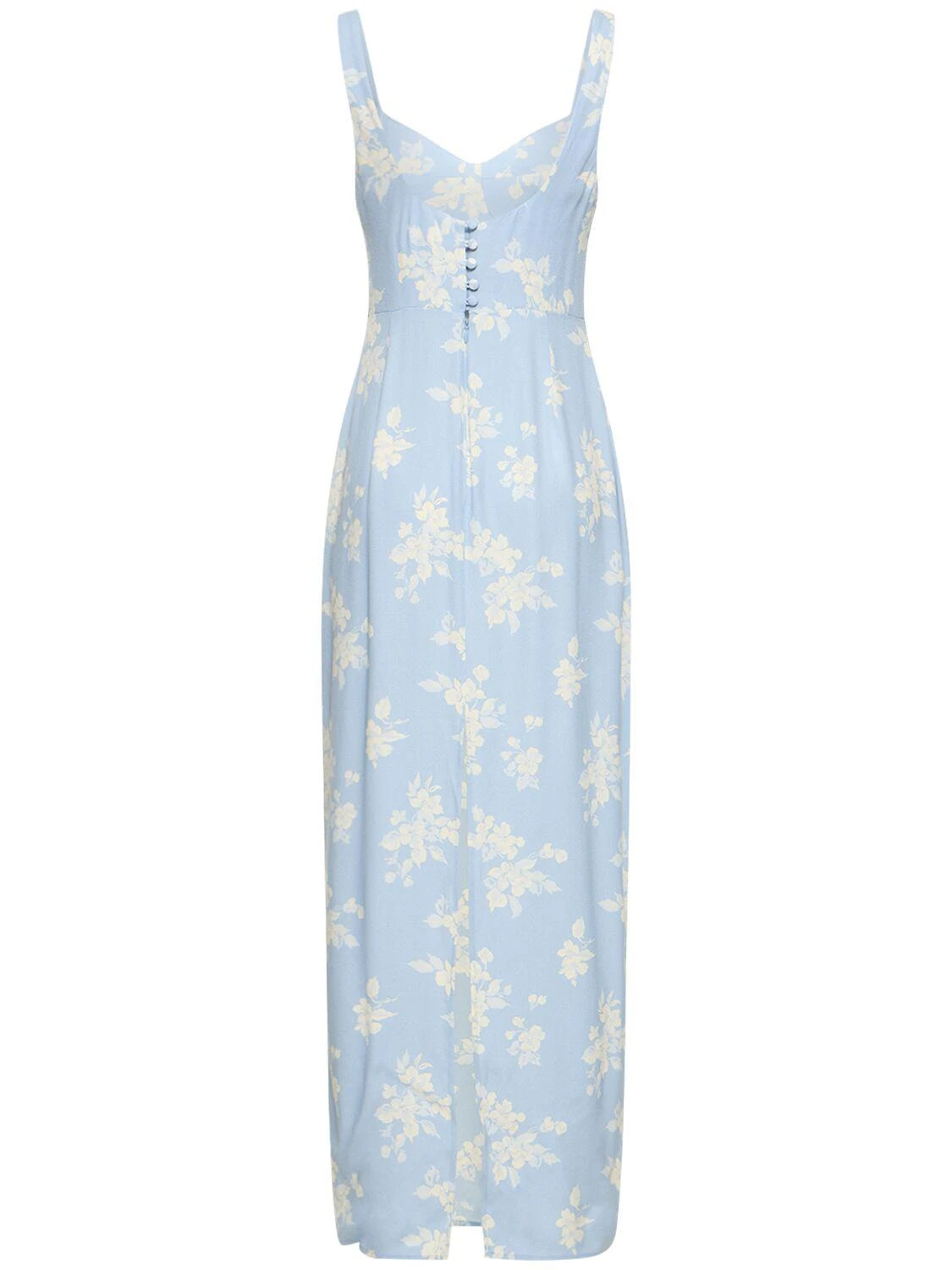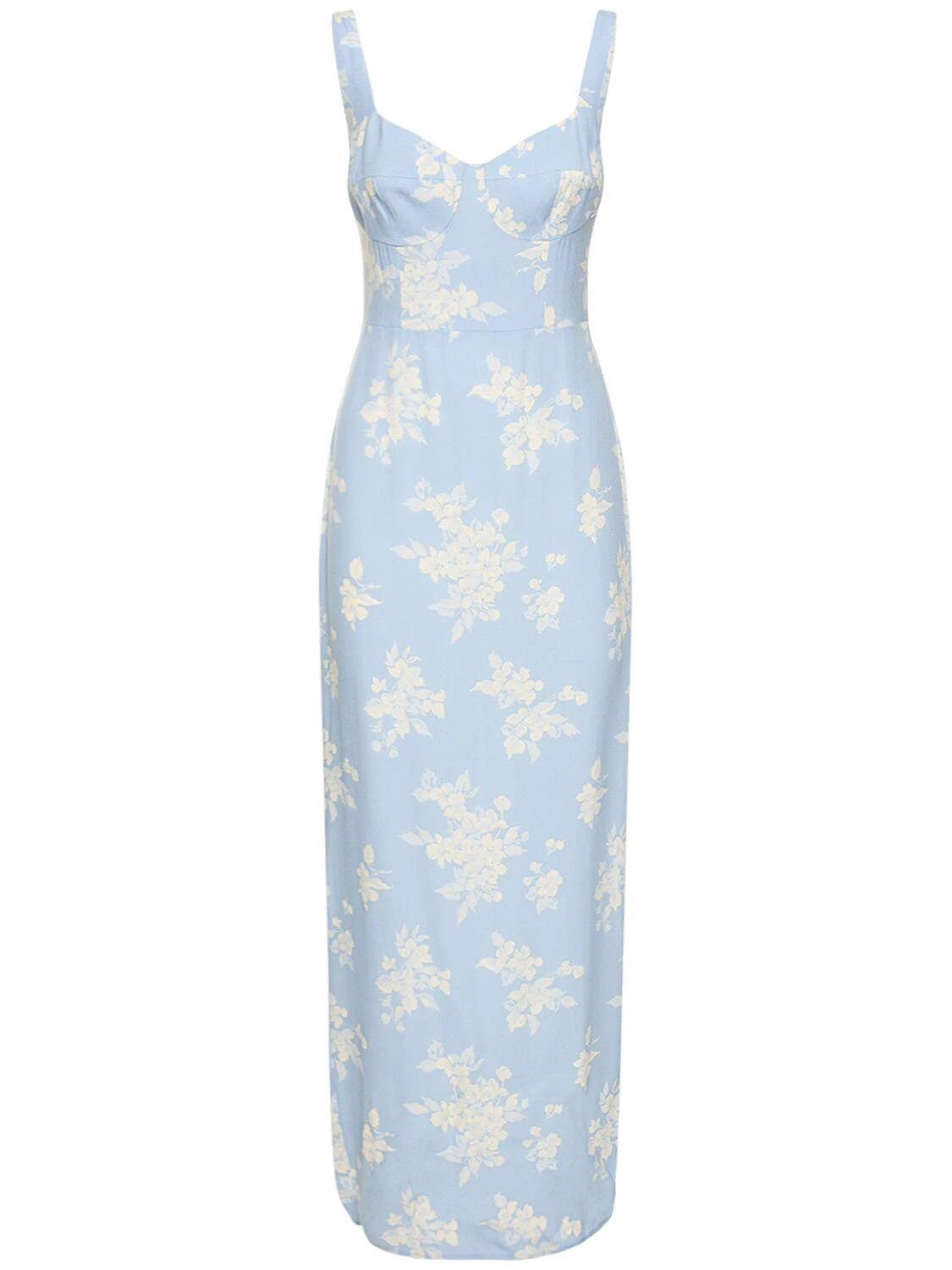 Fixed shoulder straps. All over pattern placement may vary. Model is wearing a size4. Colour: blue