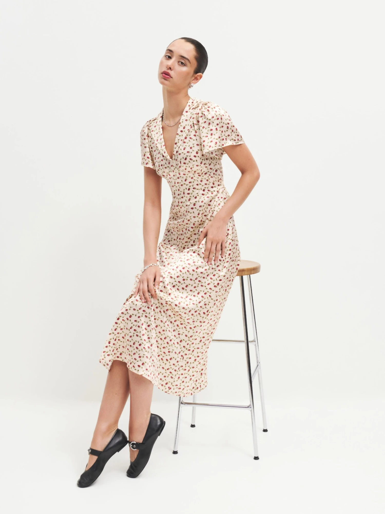 How fancy. The Seth is a midi dress with a collared neckline, flutter sleeves, and ruching at the bust. Colour: natural