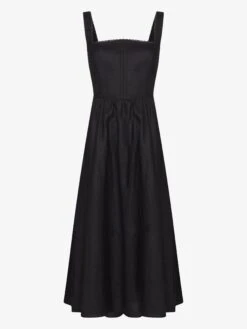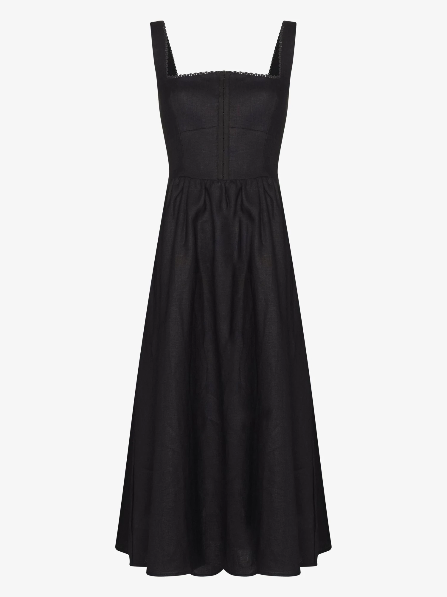 This black Reformation Tagliatelle linen midi dress is designed for a slim fit at the bust and waist, before falling into a loose, A-line skirt. Highlighted with scalloped lace trims at the neck and shoulder straps, it features a corset-inspired bodice with hook detailing, rear smocking and a back zip fastening. It’s no coincidence that this Reformation dress is named after our favourite type of pasta. It’ll look great at our local Italian restaurant. Colour: black