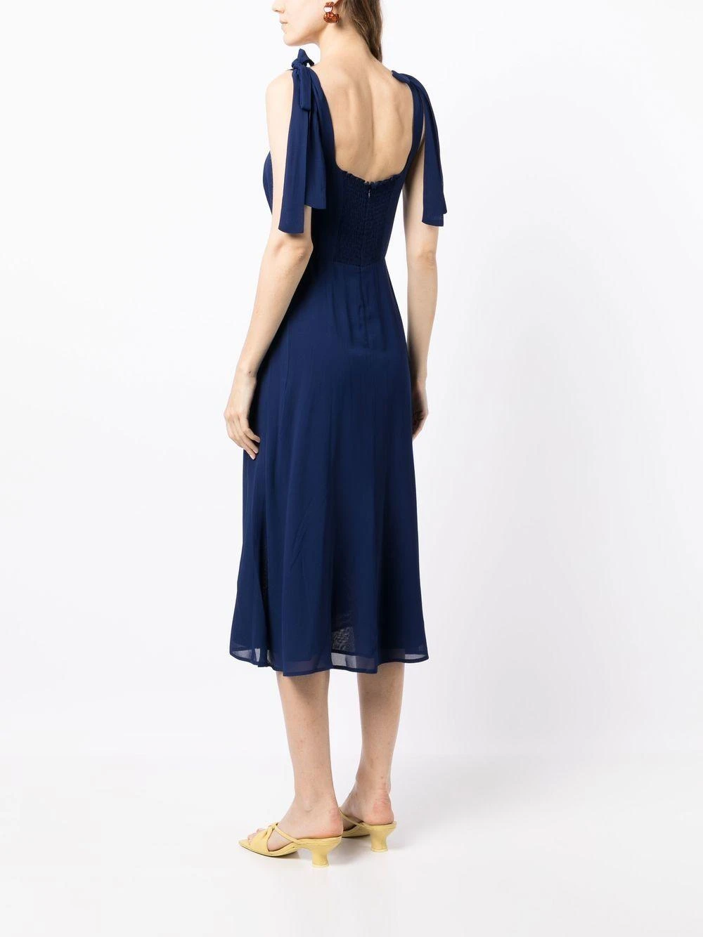 Twilight midi dress from Reformation featuring royal blue, tie-fastening straps, sleeveless, square neck, shirred panel, rear zip fastening, empire line, mid-length and shift style. Conscious: We’ve partnered with Good On You – an ethical agency that rates how sustainably brands perform. This item comes from a brand that performs well in relation to their impact on the planet. This item may not be on sale in France, UK, Italy, Belgium and Switzerland. Colour: blue