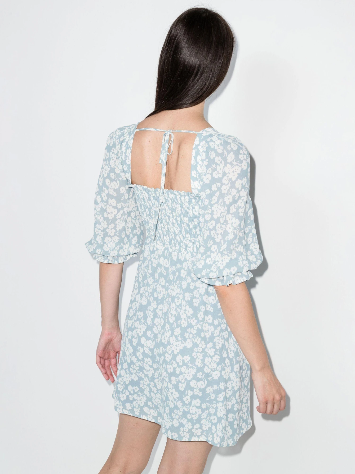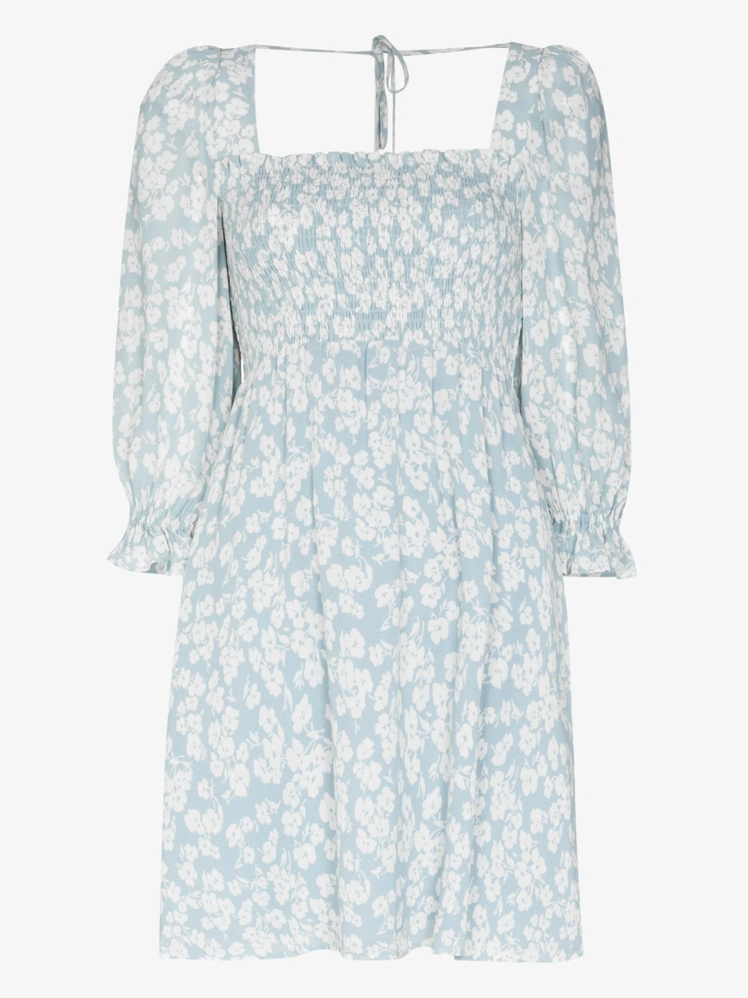 This blue Reformation Zaria square neck printed mini dress is shaped for a slim fit. It features a square neck, three-quarter puff sleeves, smocked bodice, self-tie fastenings to the back and a mid-thigh length. The name of this print is called ‘Sofie’ which means ‘wisdom. A word to the wise, this Reformation dress belongs in your wardrobe. Colour: blue
